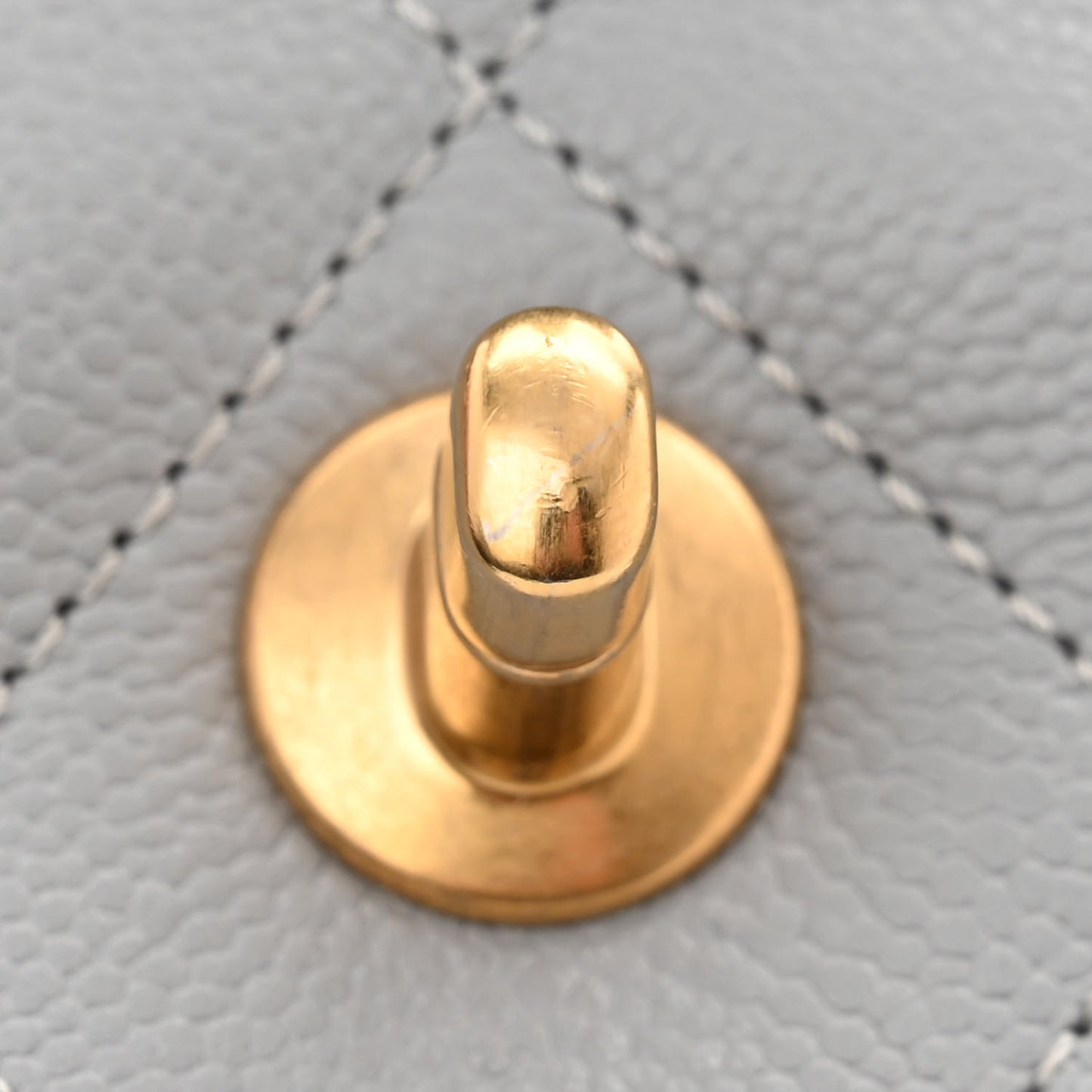This is an authentic CHANEL Caviar Quilted Mini Sweetheart Flap in Grey. This chic shoulder bag is crafted of luxurious diamond quilted caviar leather in light grey. The bag features an aged gold chain-link shoulder strap with a gold heart cinch adjustment and a crossover flap with a matching gold CC turn lock. The flap opens to an interior of grey leather with a zipper pocket.