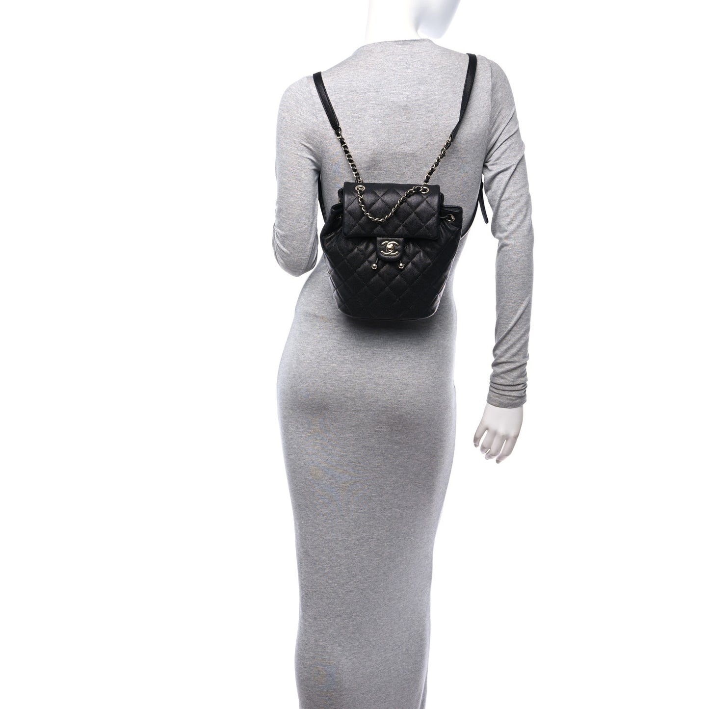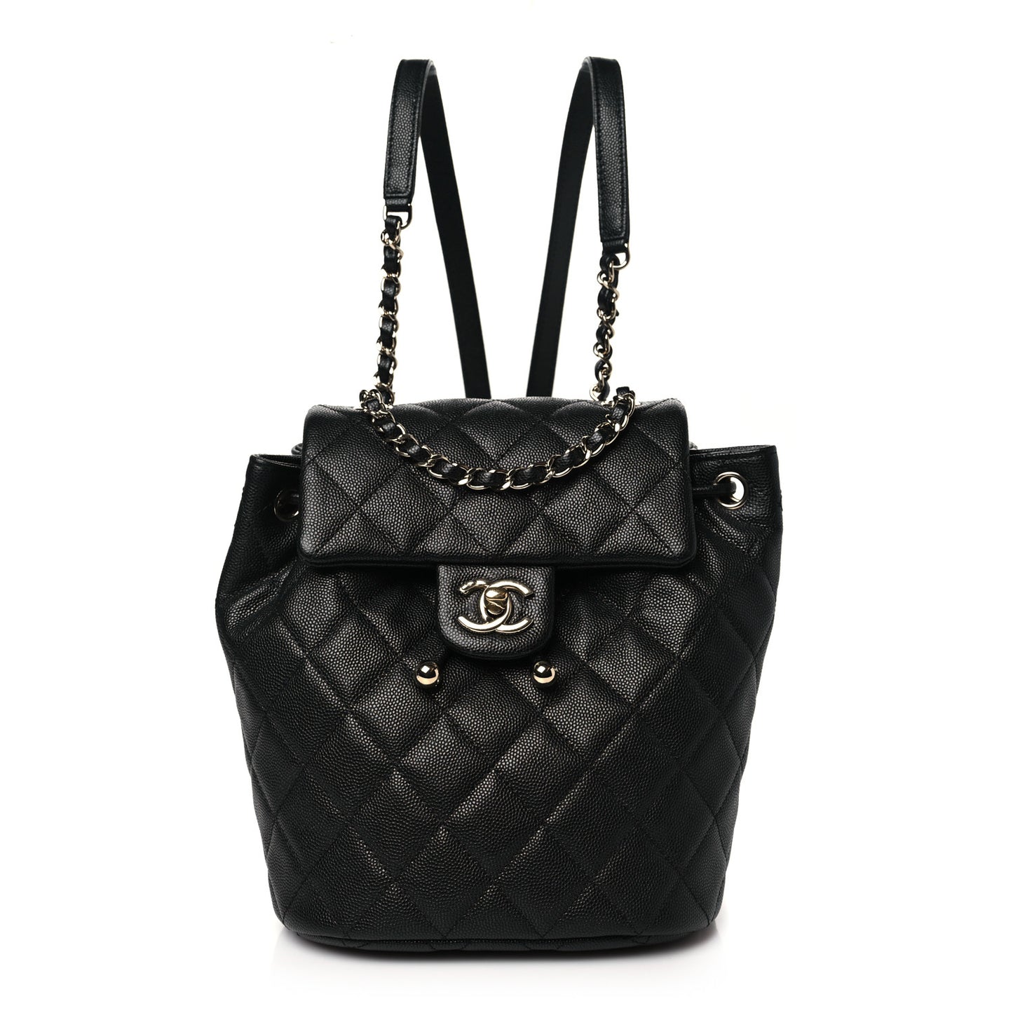 This is an authentic CHANEL Caviar Quilted Mini Urban Spirit Backpack in Black. This stylish backpack is beautifully crafted of texture diamond-quilted calfskin leather in black. It features polished gold chain link leather threaded shoulder straps, an exterior rear patch pocket, a facing external flap that opens with a polished gold Chanel CC turn lock and an open top that closes with a cinch cord. This opens to a spacious black fabric interior with zipper and patch pockets.Follow this item for alerts. Chanel is a registered trademark of Chanel. FASHIONPHILE is not affiliated with Chanel.