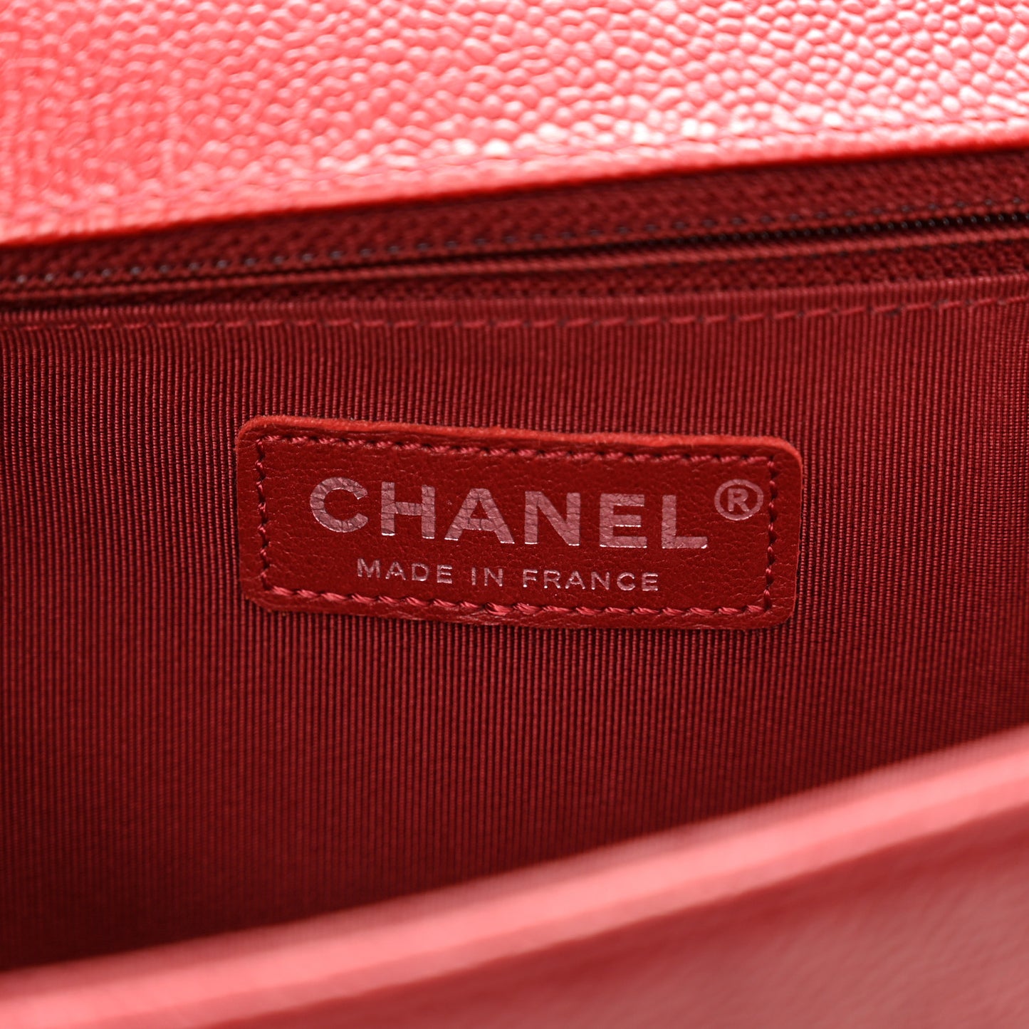 This is an authentic CHANEL Caviar Quilted New Medium Boy Flap in Dark Red. This chic shoulder bag is crafted of luxuriously textured diamond quilted caviar leather in red with a border of linear quilted leather. The bag features an aged ruthenium chain-link shoulder strap with a shoulder pad and a Chanel boy CC push lock. The front flap opens to a red fabric interior with pockets.Follow this item for alerts. Chanel is a registered trademark of Chanel. FASHIONPHILE is not affiliated with Chanel.