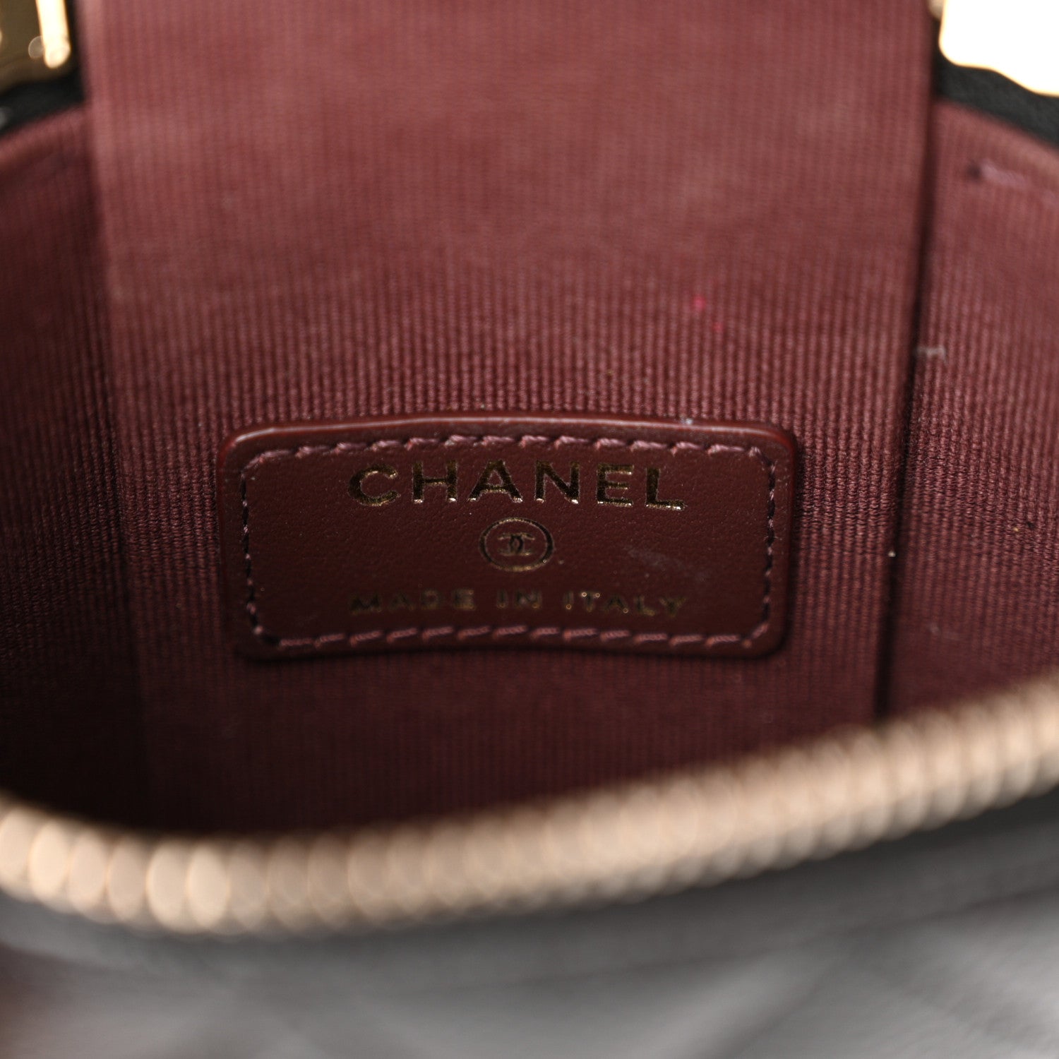 This is an authentic CHANEL Caviar Quilted Phone Holder With Chain in Black. This chic bag is crafted of luxurious diamond quilted leather in black. It features a leather threaded gold chain link shoulder strap and a gold CC logo on the front. The wrap around zipper opens to a burgundy fabric interior.Follow this item for alerts. Chanel is a registered trademark of Chanel. FASHIONPHILE is not affiliated with Chanel.