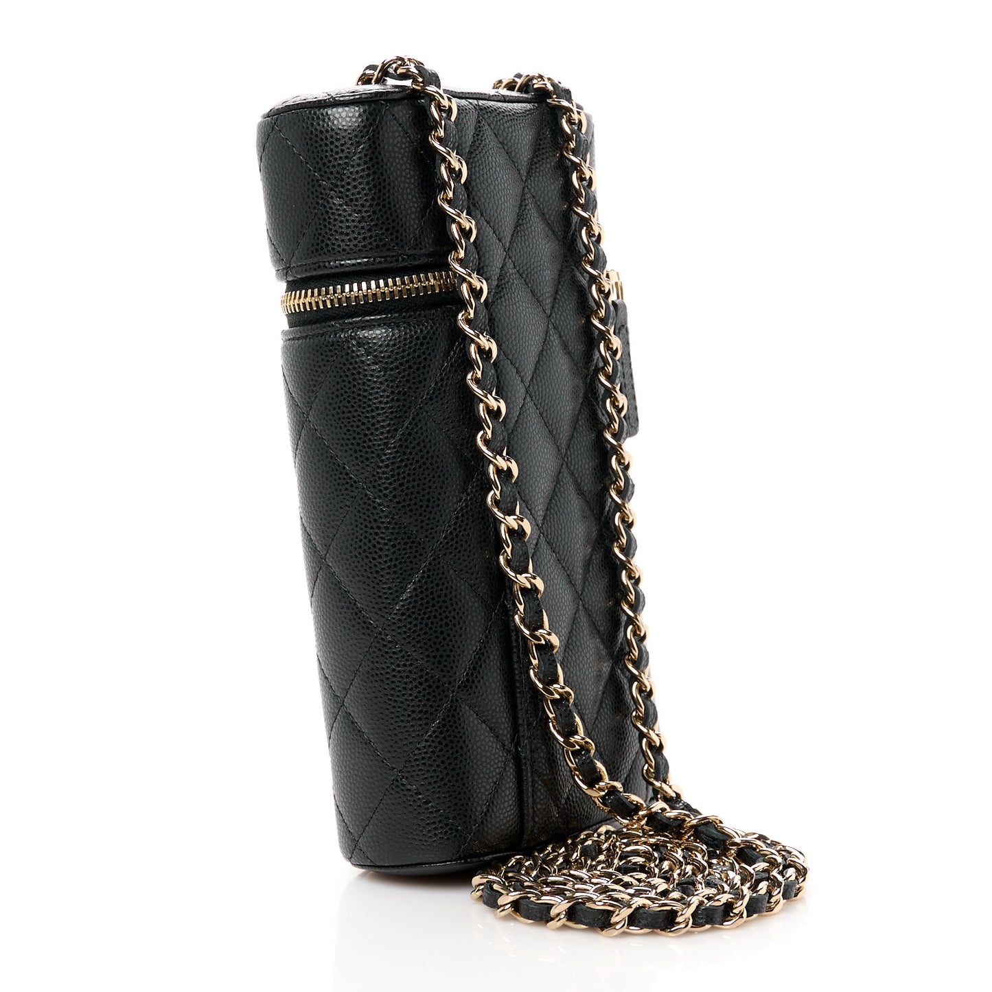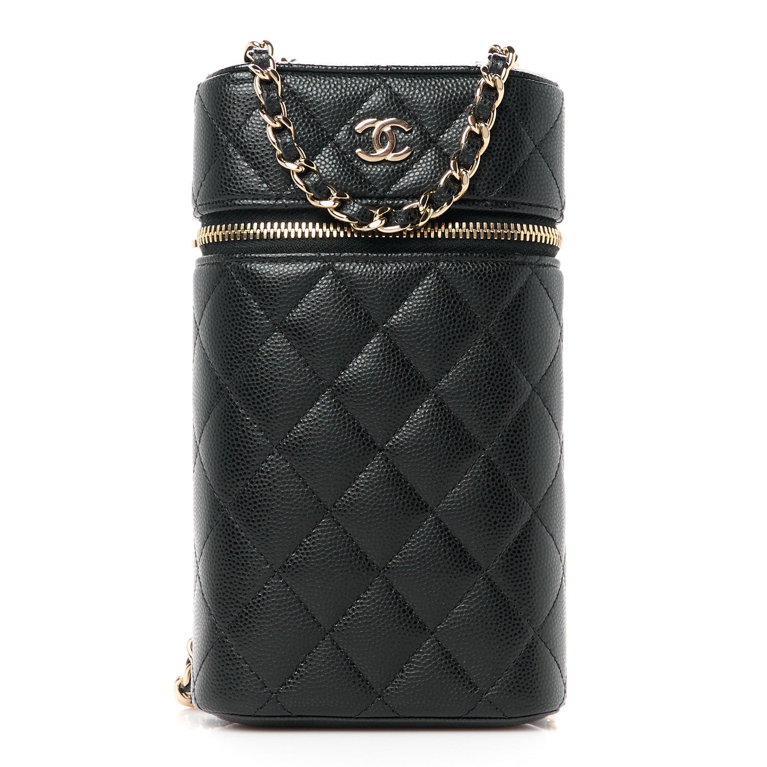This is an authentic CHANEL Caviar Quilted Phone Holder With Chain in Black. This chic bag is crafted of luxurious diamond quilted leather in black. It features a leather threaded gold chain link shoulder strap and a gold CC logo on the front. The wrap around zipper opens to a burgundy fabric interior.Follow this item for alerts. Chanel is a registered trademark of Chanel. FASHIONPHILE is not affiliated with Chanel.