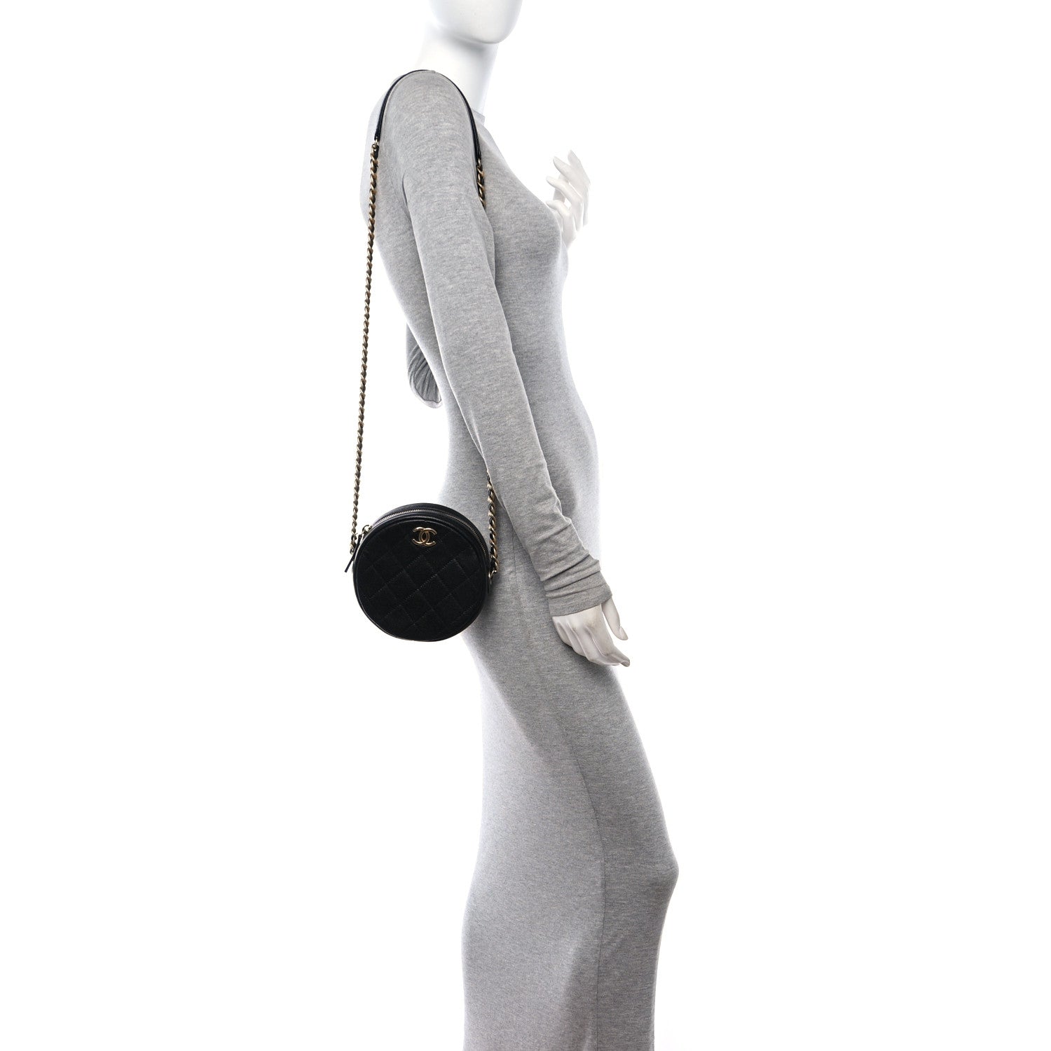 This is an authentic CHANEL Caviar Quilted Round Clutch With Chain in Black. This stylish crossbody bag is crafted of luxurious diamond-quilted caviar leather in black. The bag features a leather-threaded polished gold chain link shoulder strap, and a matching silver Chanel CC logo on the front. The wrap-around zipper opens the bag to a burgundy fabric interior with patch pockets.Follow this item for alerts. Chanel is a registered trademark of Chanel. FASHIONPHILE is not affiliated with Chanel.