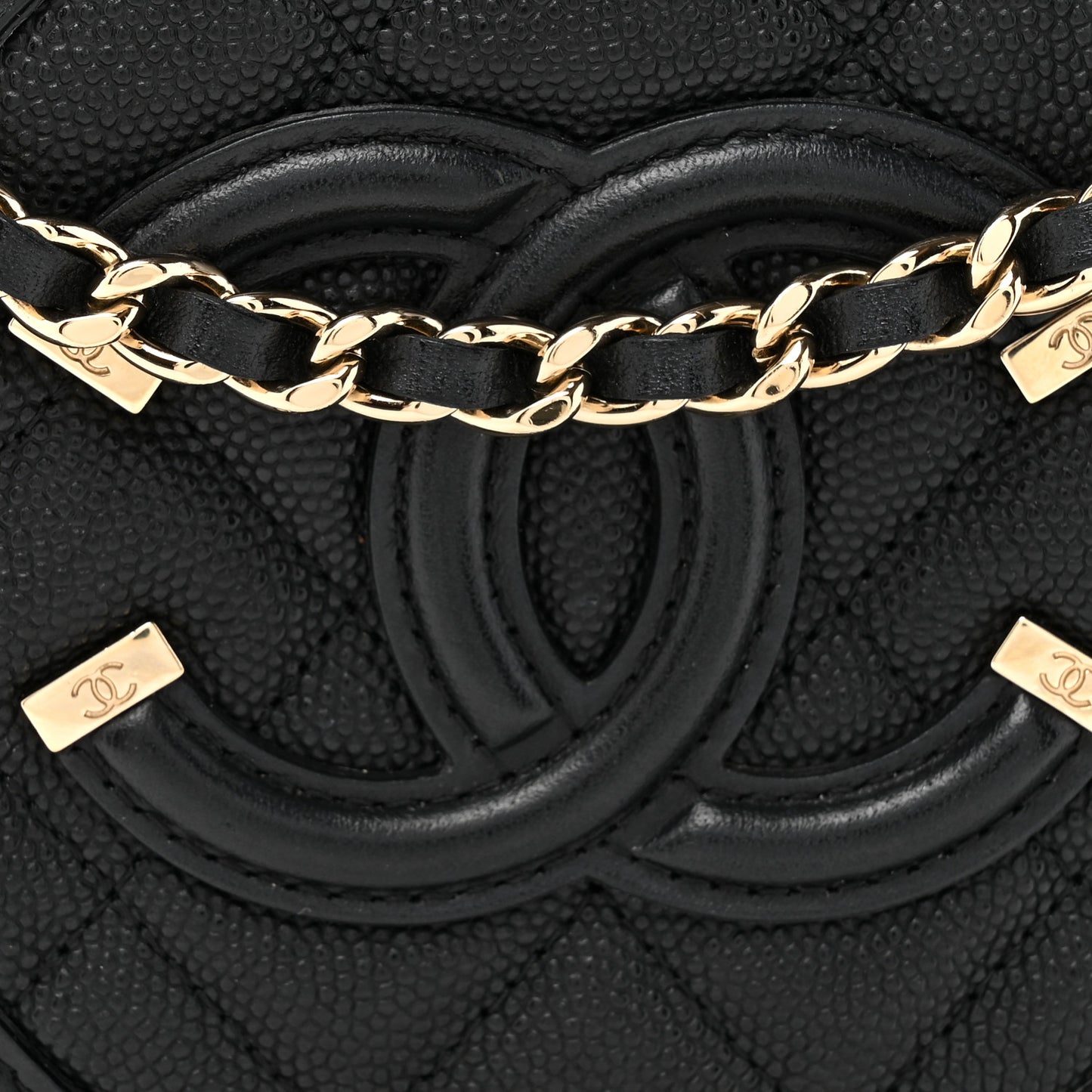 This is an authentic CHANEL Caviar Quilted Round Filigree Crossbody in Black. This stylish shoulder bag is crafted of luxurious caviar leather in black. The bag features a brass chain link leather threaded shoulder strap. This shoulder bag opens a top zipper to a fabric interior with a patch pocket.Follow this item for alerts. Chanel is a registered trademark of Chanel. FASHIONPHILE is not affiliated with Chanel.