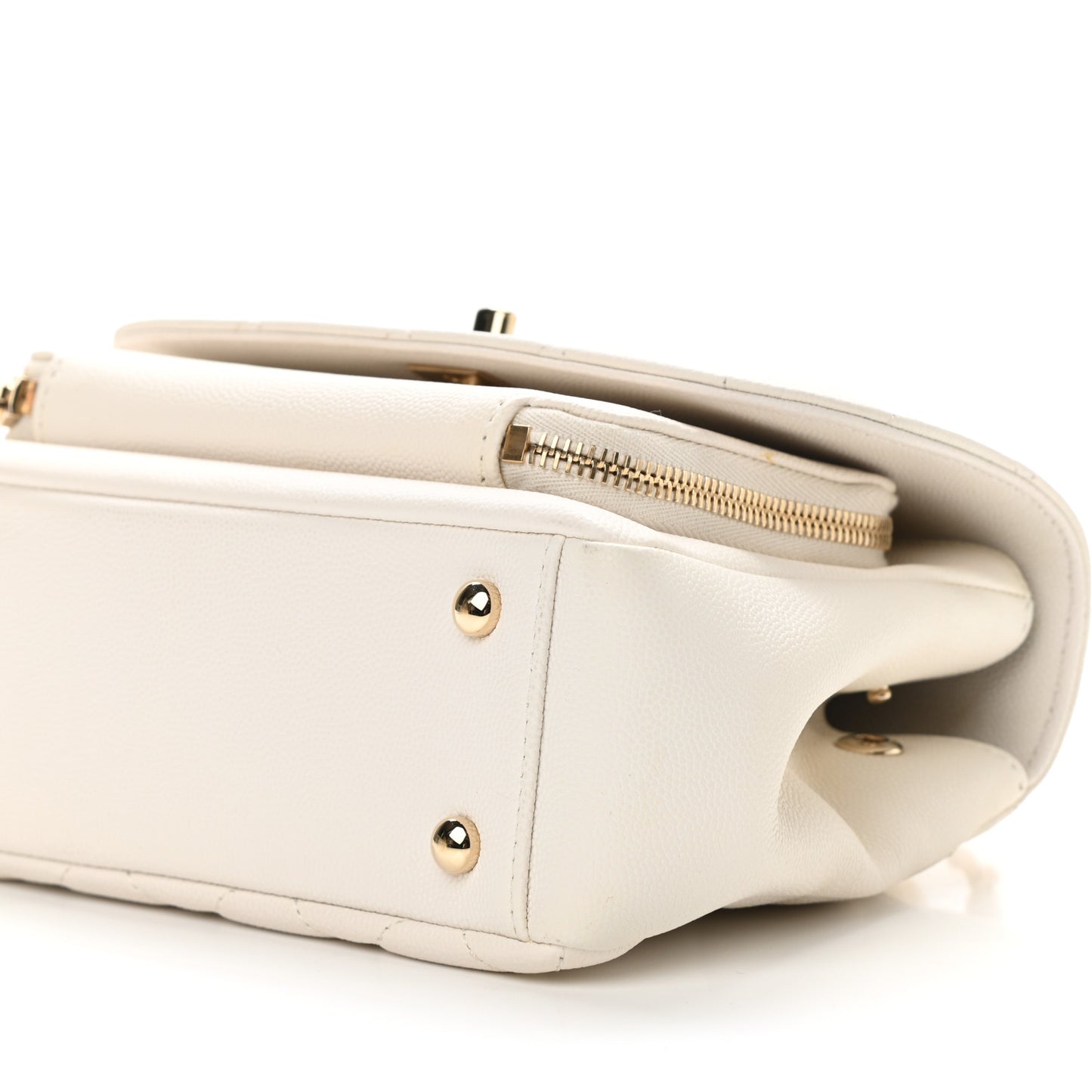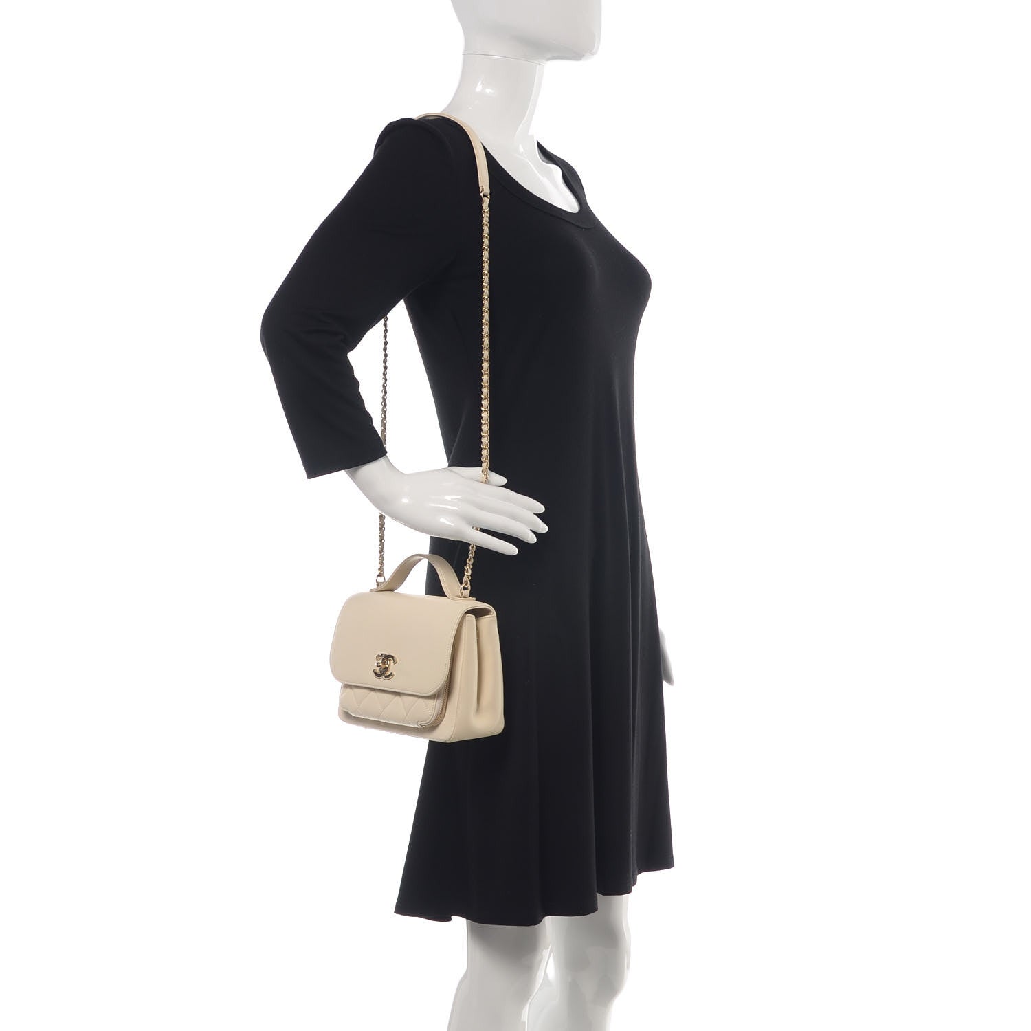 This is an authentic CHANEL Caviar Quilted Small Business Affinity Flap in White. This sleek classic hand bag is crafted of diamond stitched grained caviar calfskin leather in white. The shoulder bag features a white leather top handle, a gold chain link leather threaded shoulder strap with a shoulder pad, and a rear patch pocket and a gold CC turn clock closure. This opens the flap to a zippered front pocket and a white fabric interior with zipper and patch pockets.Follow this item for alerts. Chanel is a registered trademark of Chanel. FASHIONPHILE is not affiliated with Chanel.