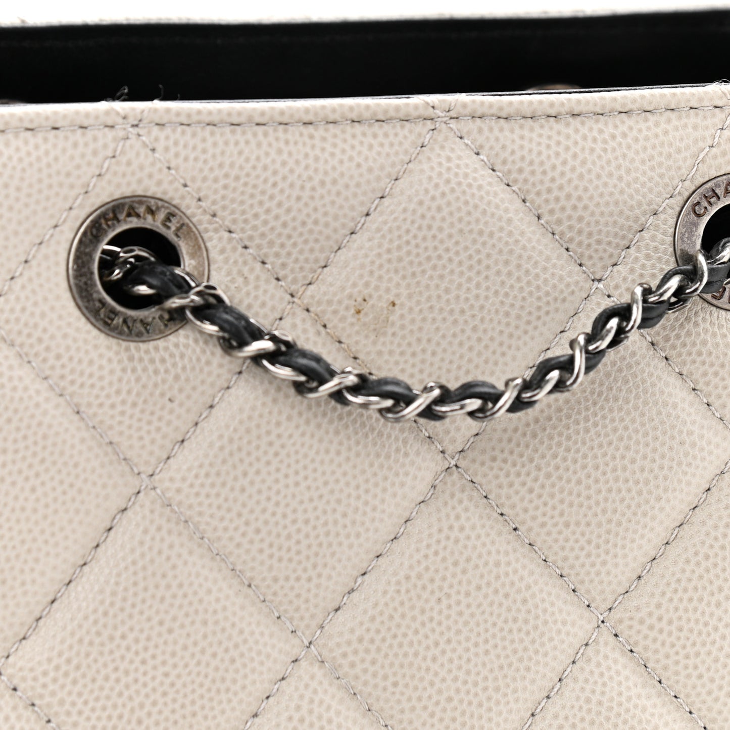 This is an authentic CHANEL Caviar Quilted Small CC Bucket Bag in Grey This stylish handbag is crafted of diamond-quilted caviar leather in grey. The bag features a black leather top leather handle, an optional ruthenium chain shoulder strap with a shoulder pad, and a leather threaded chain cinch-cord along the top frame that tightens with a ruthenium CC logo. The top is open to a black fabric interior with patch pockets.