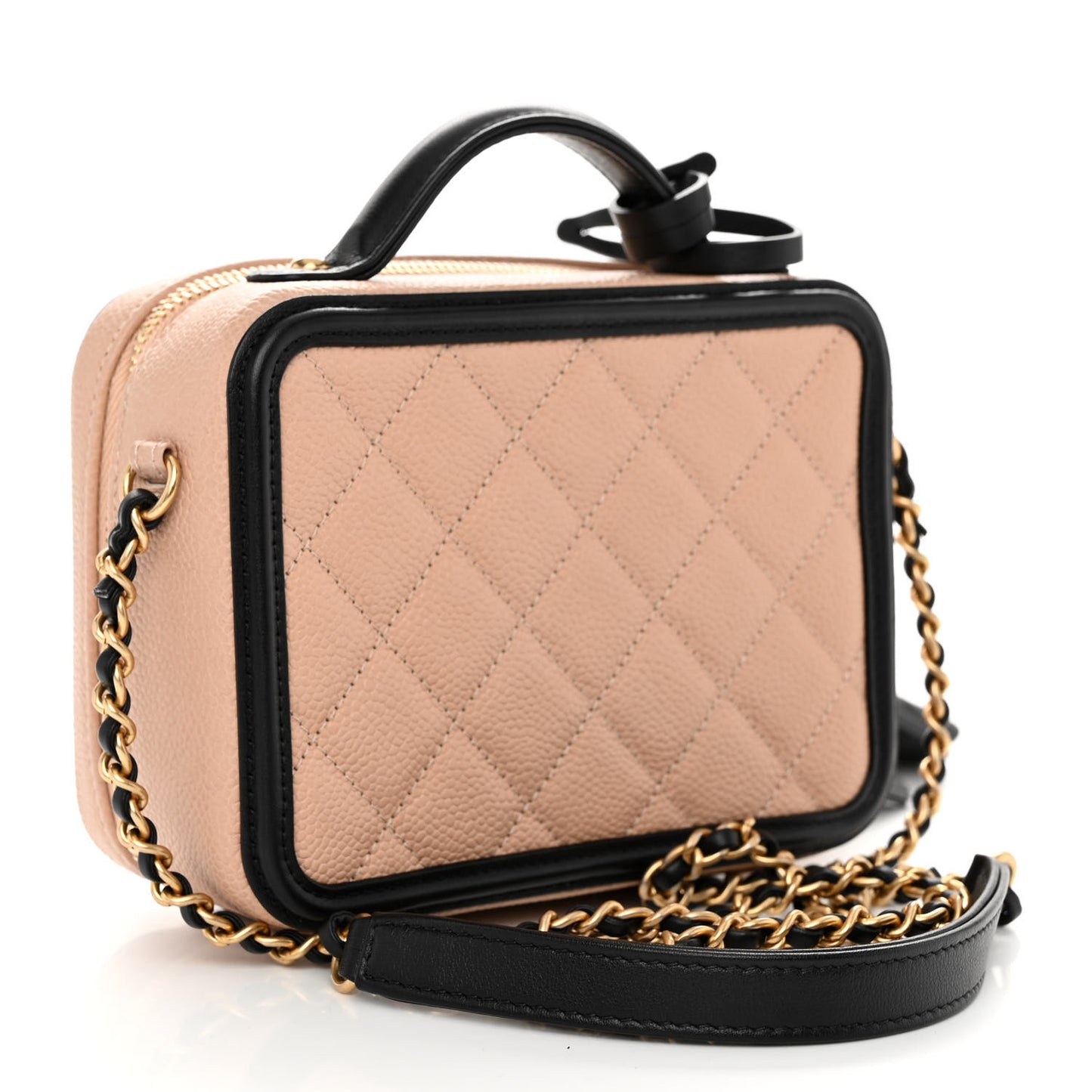 This is an authentic CHANEL Caviar Quilted Small CC Filigree Vanity Case in Beige and Black. This chic stylish travel bag is crafted of luxurious diamond quilted caviar leather in beige with black leather trim and a top handle. The elegant shoulder bag features a gold chain-link black leather threaded shoulder strap and a large Chanel CC stitched logo on the front. The two zippers open all around to a partitioned black leather interior with a flat pocket.Follow this item for alerts. Chanel is a registered trademark of Chanel. FASHIONPHILE is not affiliated with Chanel.