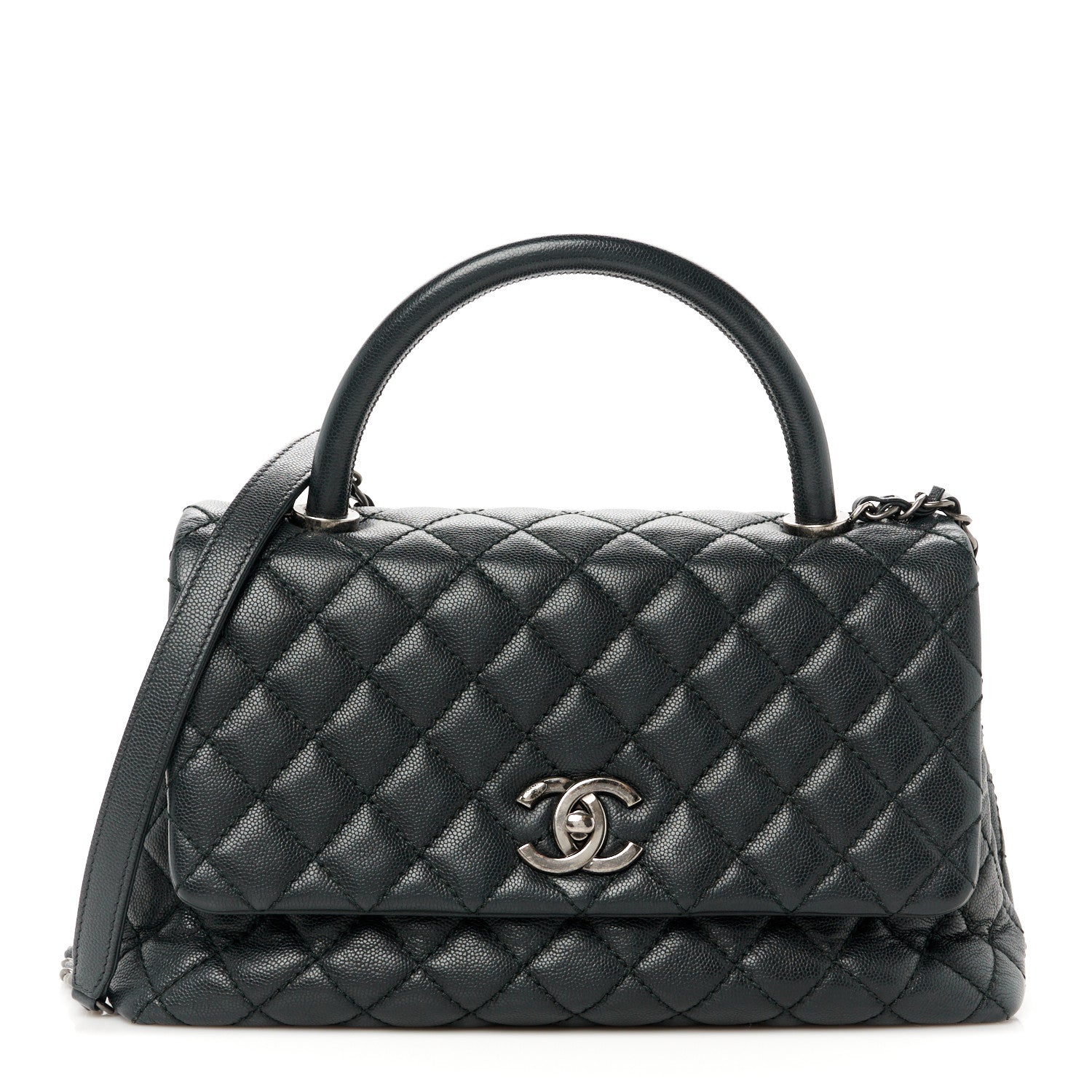 This is an authentic CHANEL Caviar Quilted Small Coco Handle Flap Black. This handbag is crafted of diamond-quilted caviar leather in black. It features a black leather top handle, a rear patch pocket, a leather threaded ruthenium chain-link shoulder strap with a leather shoulder pad, and a ruthenium CC turn-lock closure. This opens to a partitioned burgundy fabric interior with zipper and patch pockets.Follow this item for alerts. Chanel is a registered trademark of Chanel. FASHIONPHILE is not affiliated with Chanel.