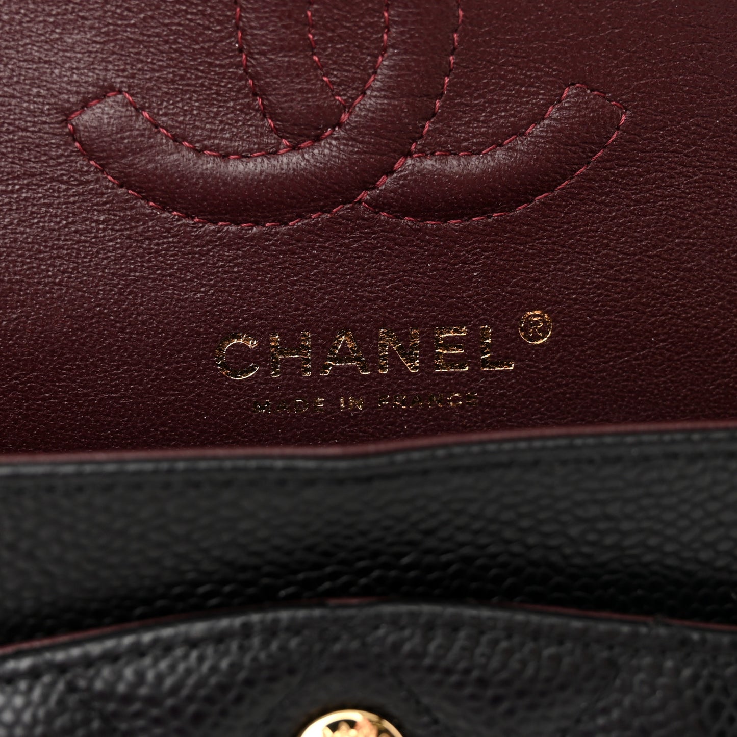 This is an authentic CHANEL Caviar Quilted Small Double Flap in Black. This elegant shoulder bag is crafted of luxurious caviar textured leather in black. The bag features a leather-threaded gold chain-link shoulder strap, a rear patch pocket, and a crossover flap with a gold classic CC turn lock. The flap opens to reveal an inner flap and a burgundy leather interior with pockets.Follow this item for alerts. Chanel is a registered trademark of Chanel. FASHIONPHILE is not affiliated with Chanel.