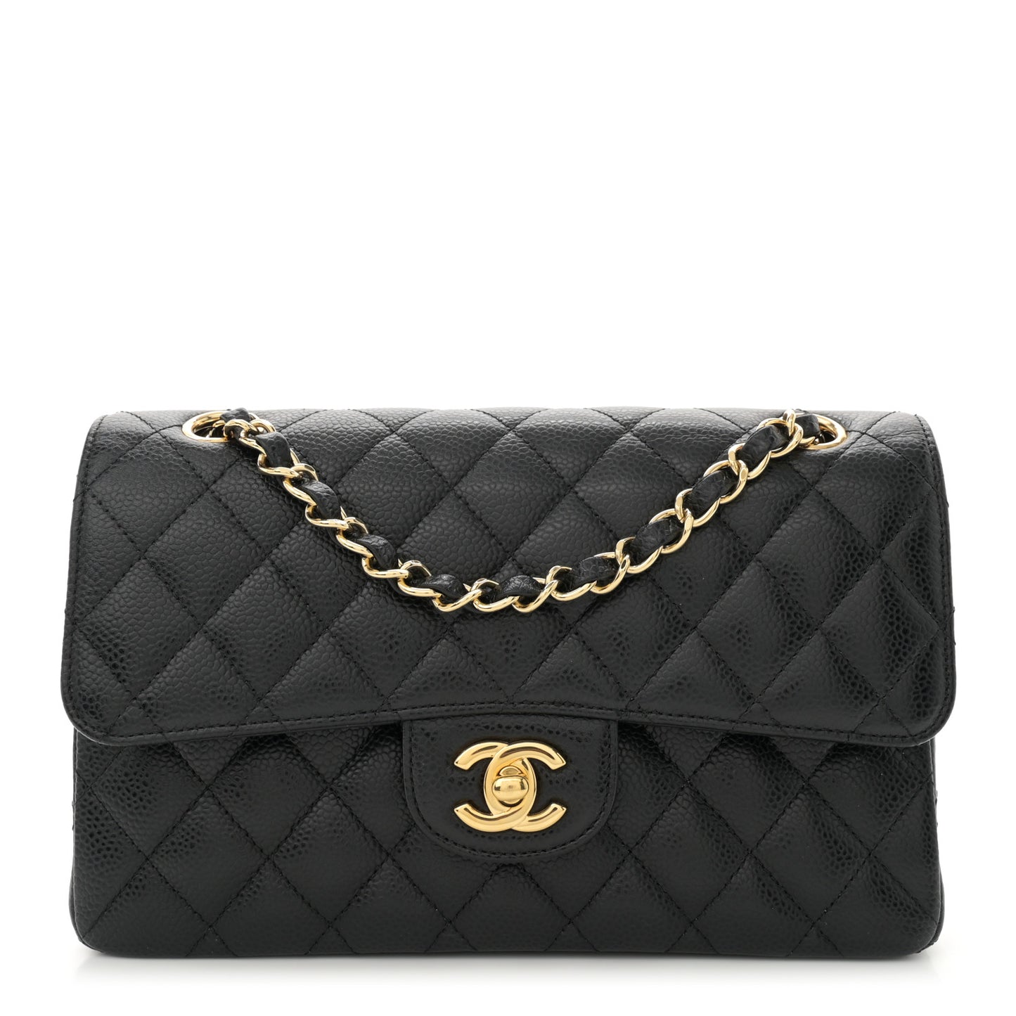 This is an authentic CHANEL Caviar Quilted Small Double Flap in Black. This chic shoulder bag is crafted of diamond quilted caviar leather in black. The bag features a gold-tone chain link leather threaded shoulder strap and front flap with a CC turn lock. The flap opens to an inner flap and a burgundy leather interior with patch pockets.Follow this item for alerts. Chanel is a registered trademark of Chanel. FASHIONPHILE is not affiliated with Chanel.