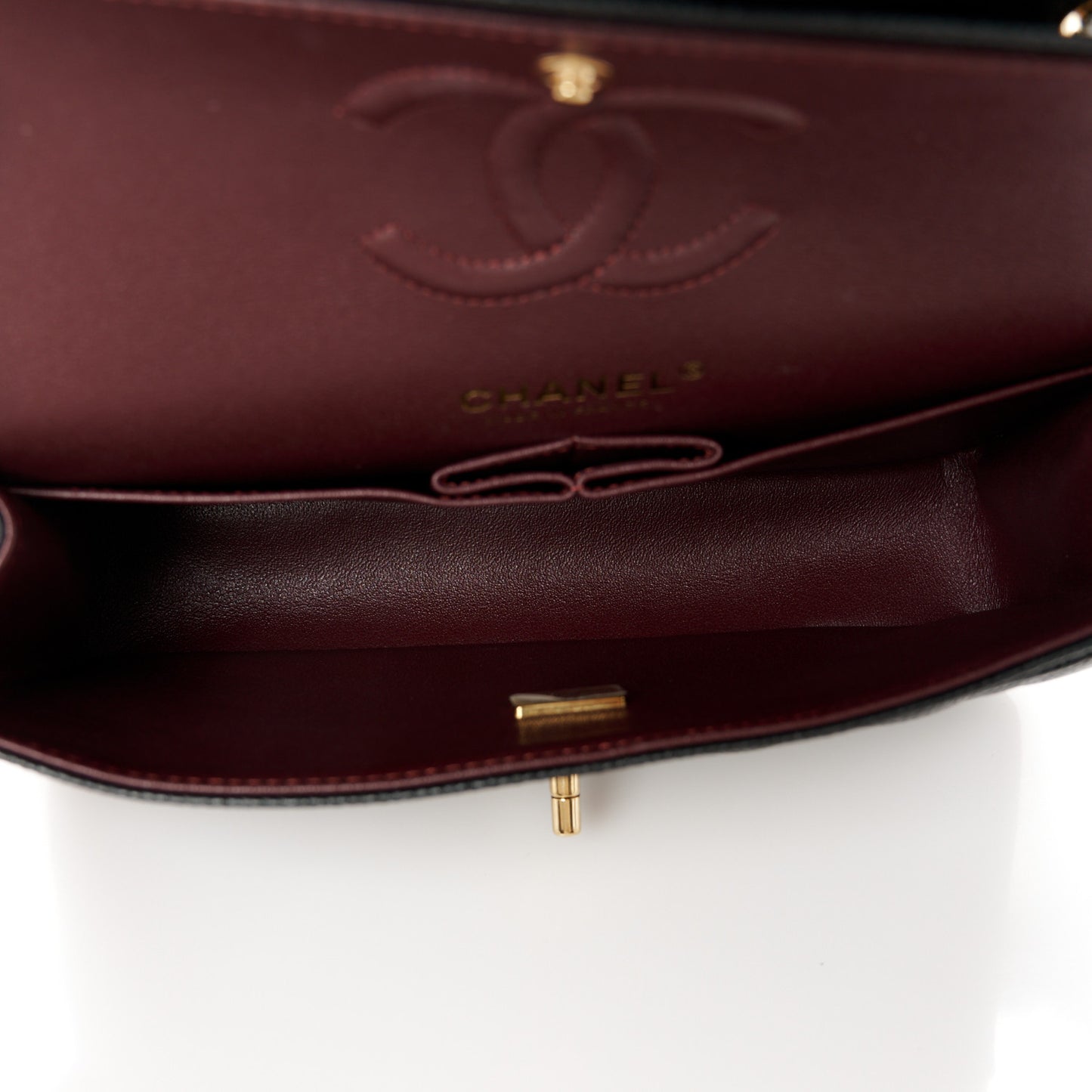 This is an authentic CHANEL Caviar Quilted Small Double Flap in Black. This chic shoulder bag is crafted of diamond quilted caviar leather in black. The bag features a gold chain link leather threaded shoulder strap and front flap with a gold Chanel CC turn lock. The flap opens to an inner flap and a burgundy leather interior with patch pockets.