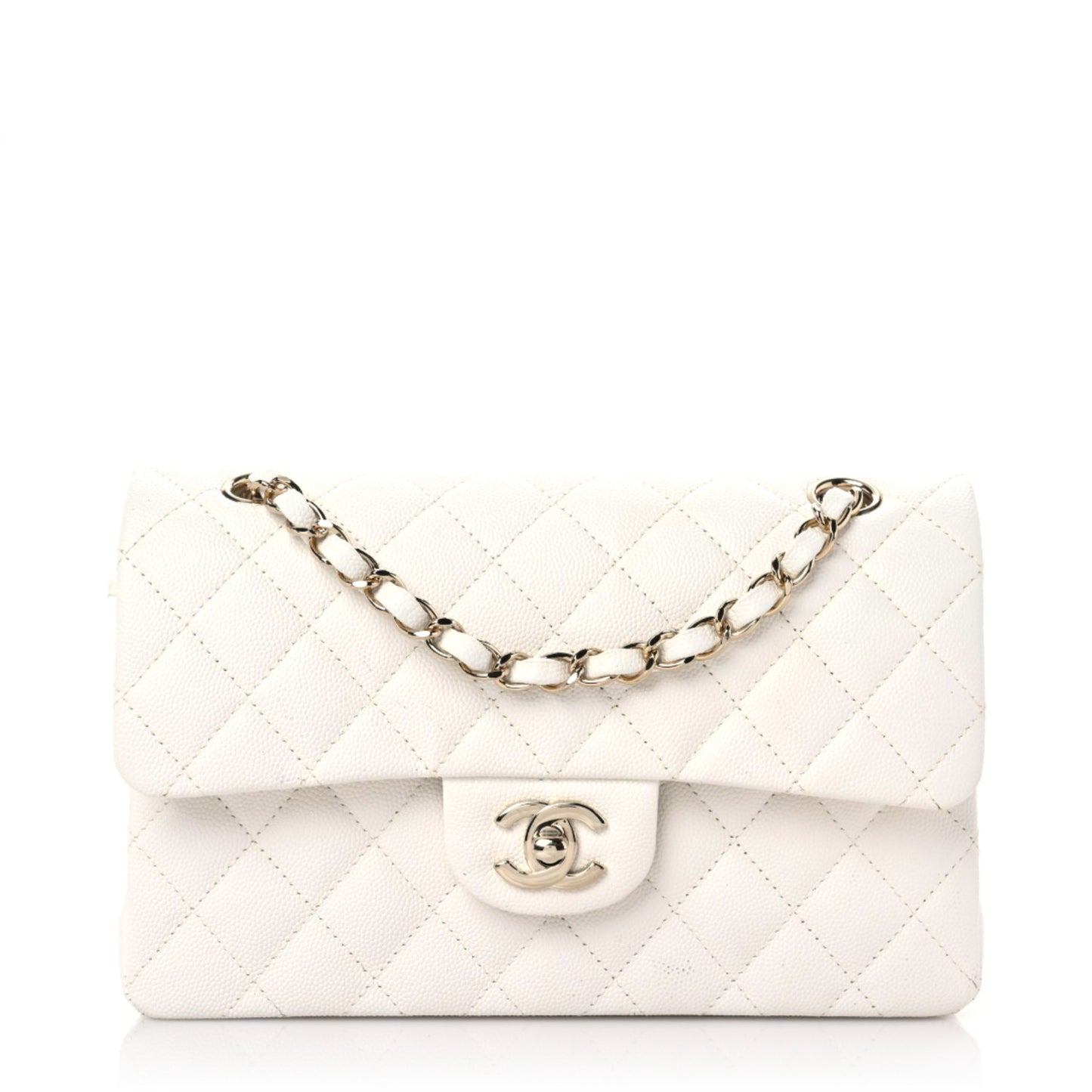 This is an authentic CHANEL Caviar Quilted Small Double Flap in White. This bag is crafted of white caviar leather with iconic diamond-shaped stitching. The bag features a leather threaded light gold chain shoulder strap and a gold Chanel CC turn lock. This opens to an inner flap and a leather interior with patch pockets.Follow this item for alerts. Chanel is a registered trademark of Chanel. FASHIONPHILE is not affiliated with Chanel.