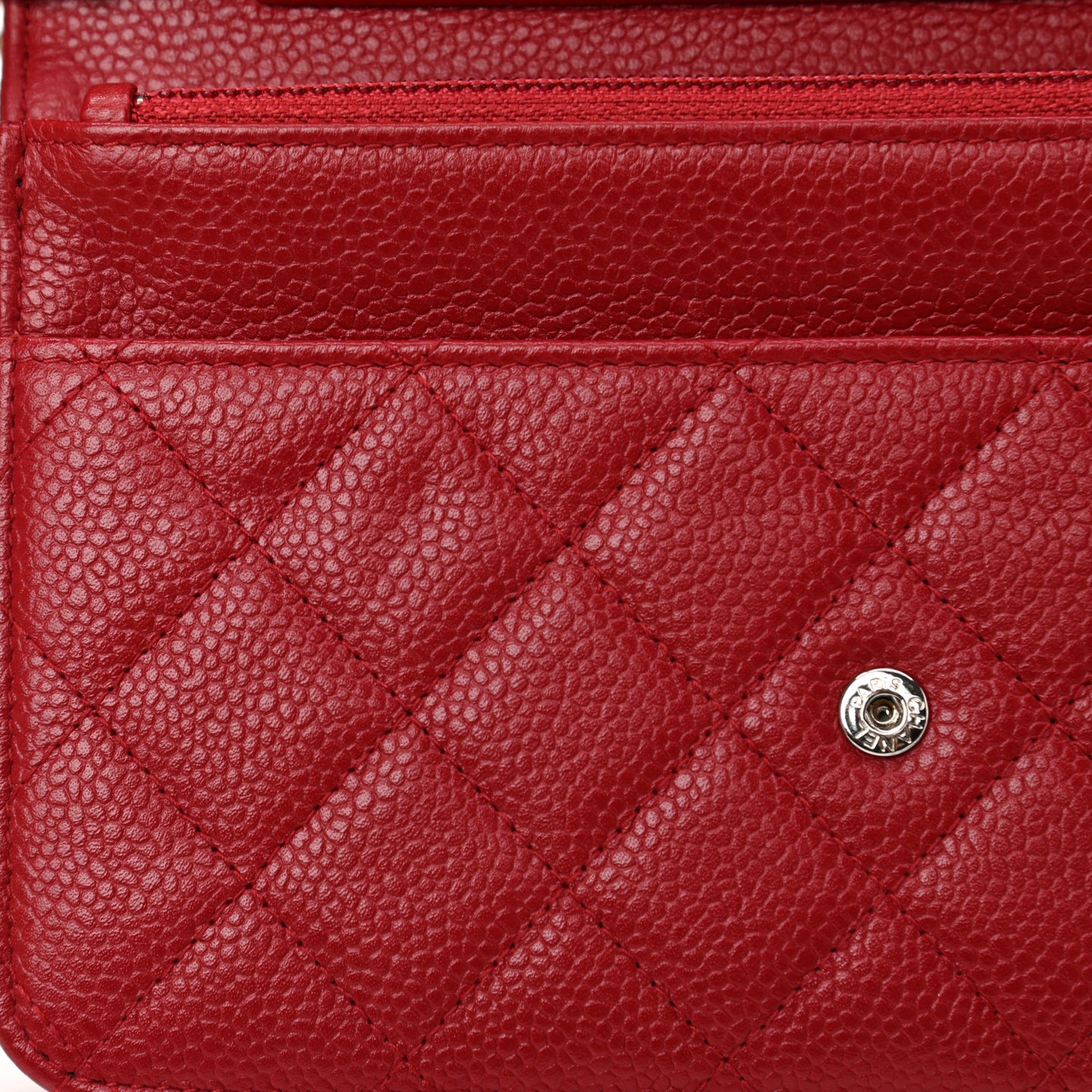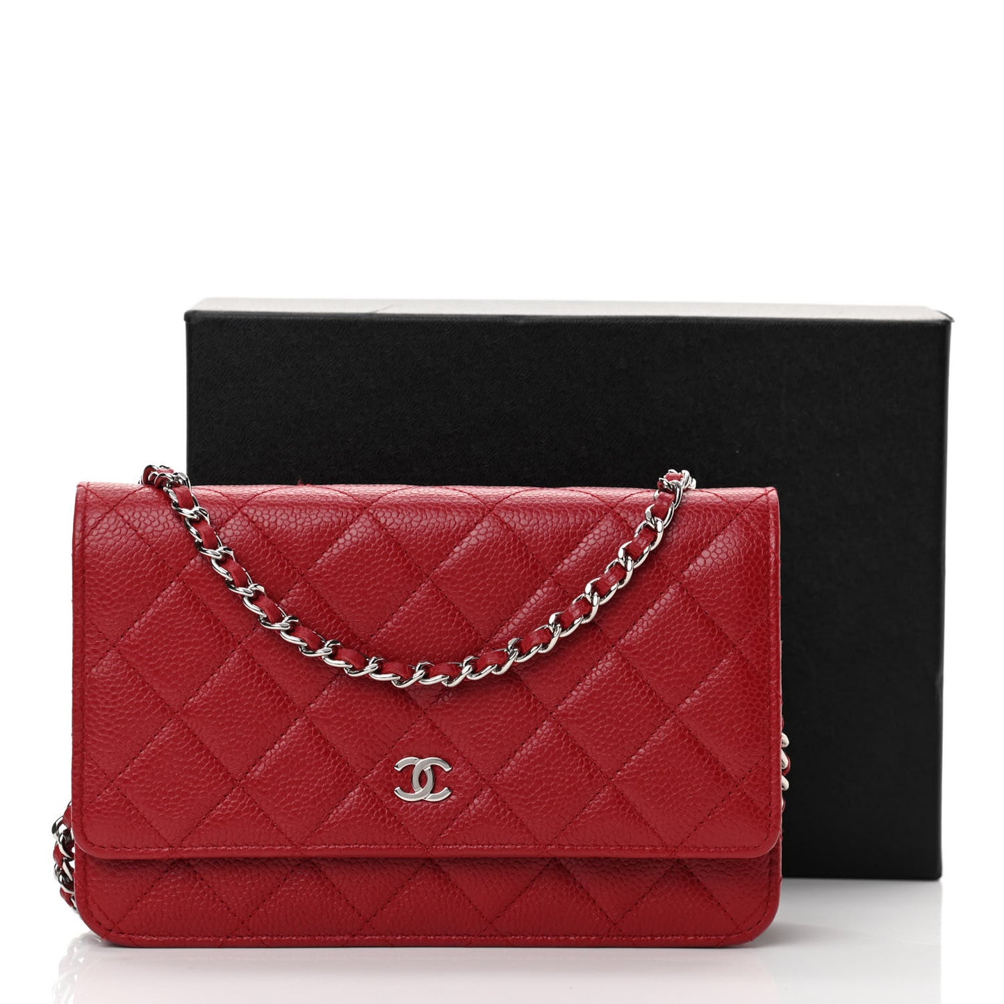 This is an authentic CHANEL Caviar Quilted Wallet On Chain WOC in Red. This is a chic wallet on a chain that is crafted beautifully of luxurious diamond quilted caviar leather in red. The crossbody features a silver leather threaded crossbody shoulder strap, and a front flap with a small silver CC logo on the front. This opens to an interior of red fabric with card slots, patch pocket, and zipper compartment.Follow this item for alerts. Chanel is a registered trademark of Chanel. FASHIONPHILE is not affiliated with Chanel.