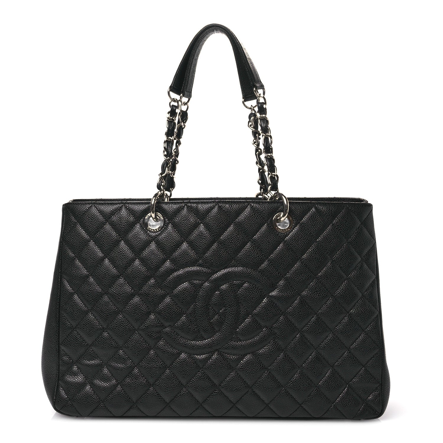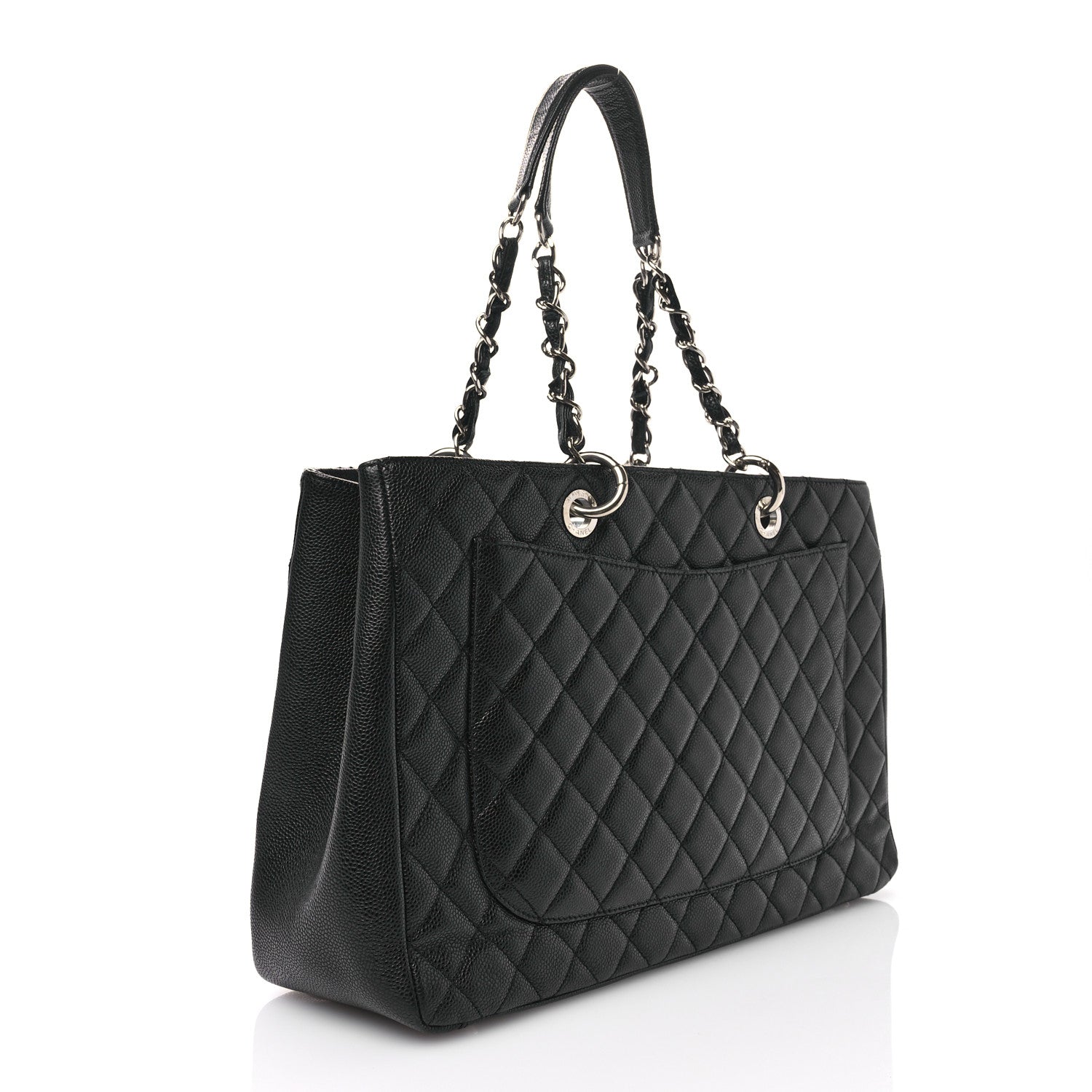 This is an authentic CHANEL Caviar Quilted XL Grand Shopping Tote GST in Black. This stunning tote is beautifully crafted of luxurious diamond-quilted caviar leather in black. The bag features leather-threaded gold chain shoulder straps with leather shoulder pads, a prominent quilted Chanel CC logo on the front, and a wide rear pocket. The top is open to a partitioned black satin fabric interior with zipper and patch pockets.Follow this item for alerts. Chanel is a registered trademark of Chanel. FASHIONPHILE is not affiliated with Chanel.