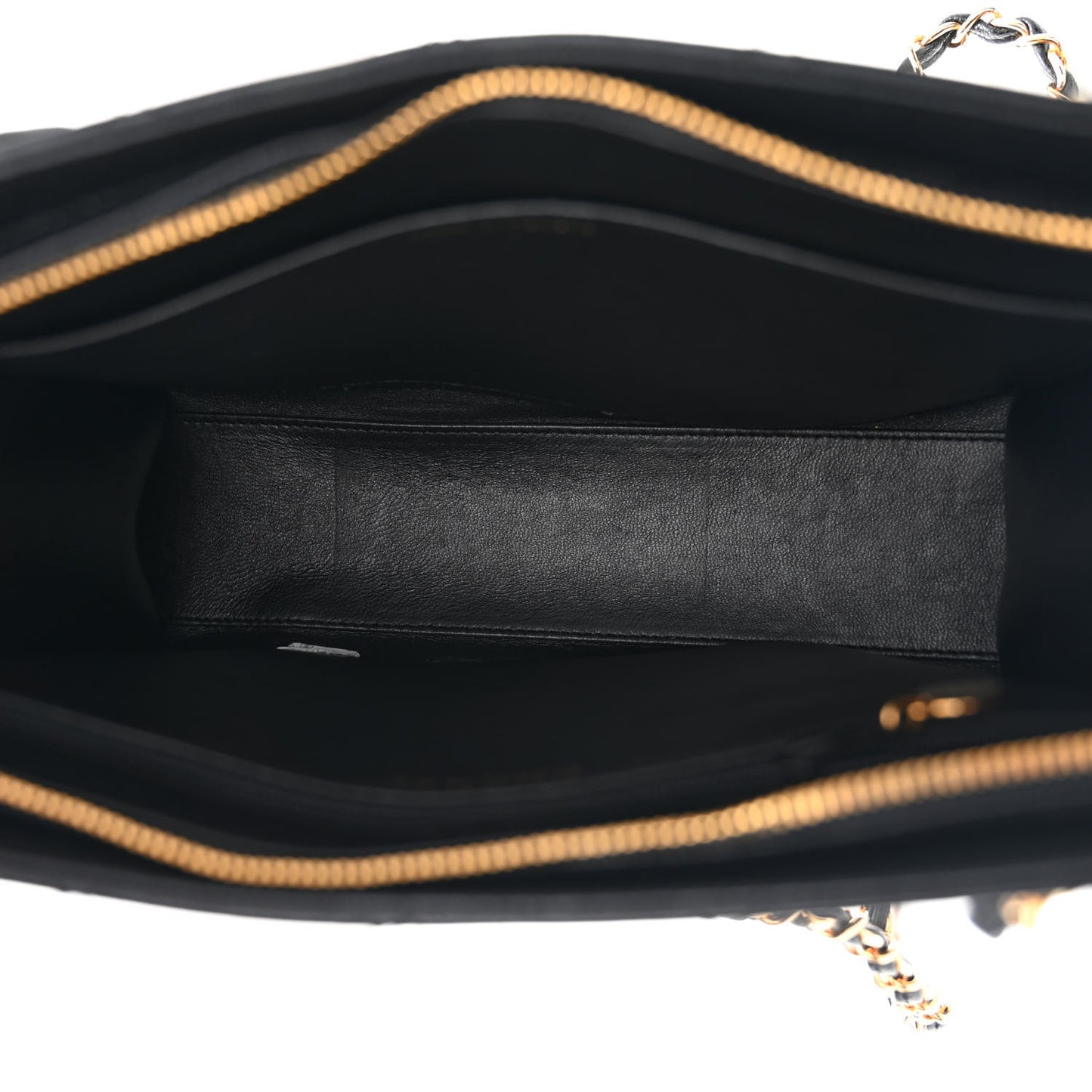 This is an authentic CHANEL Caviar Shopper Tote in Black. This chic vintage tote is crafted of luxurious black caviar leather. The bag features tall gold chain link shoulder straps threaded with black leather and a gold plated Chanel CC turn lock at the top which secures a wide frontal pocket. The top opens to a black leather interior with zipper pockets.