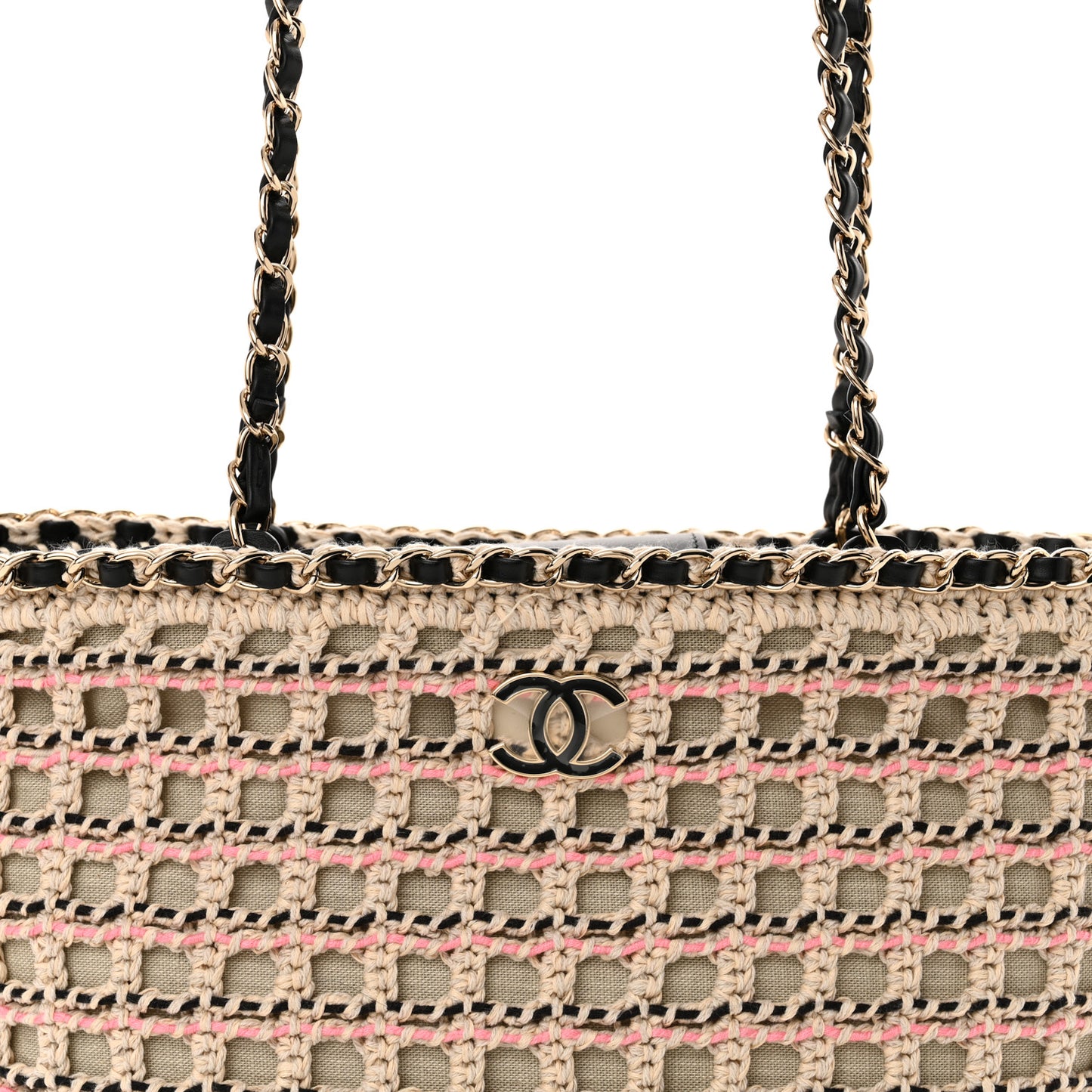 This is an authentic CHANEL Cotton Crochet Le Panier Small Shopping Bag in Black, Beige and Pink. This chic bag is crafted of a beige natural fiber with pink and black accents. The shoulder bag features a gold chain link leather threaded shoulder strap and a black and gold CC logo. The leather crossover top flap opens to a beige fabric interior with a zipper pocket.Follow this item for alerts. Chanel is a registered trademark of Chanel. FASHIONPHILE is not affiliated with Chanel.
