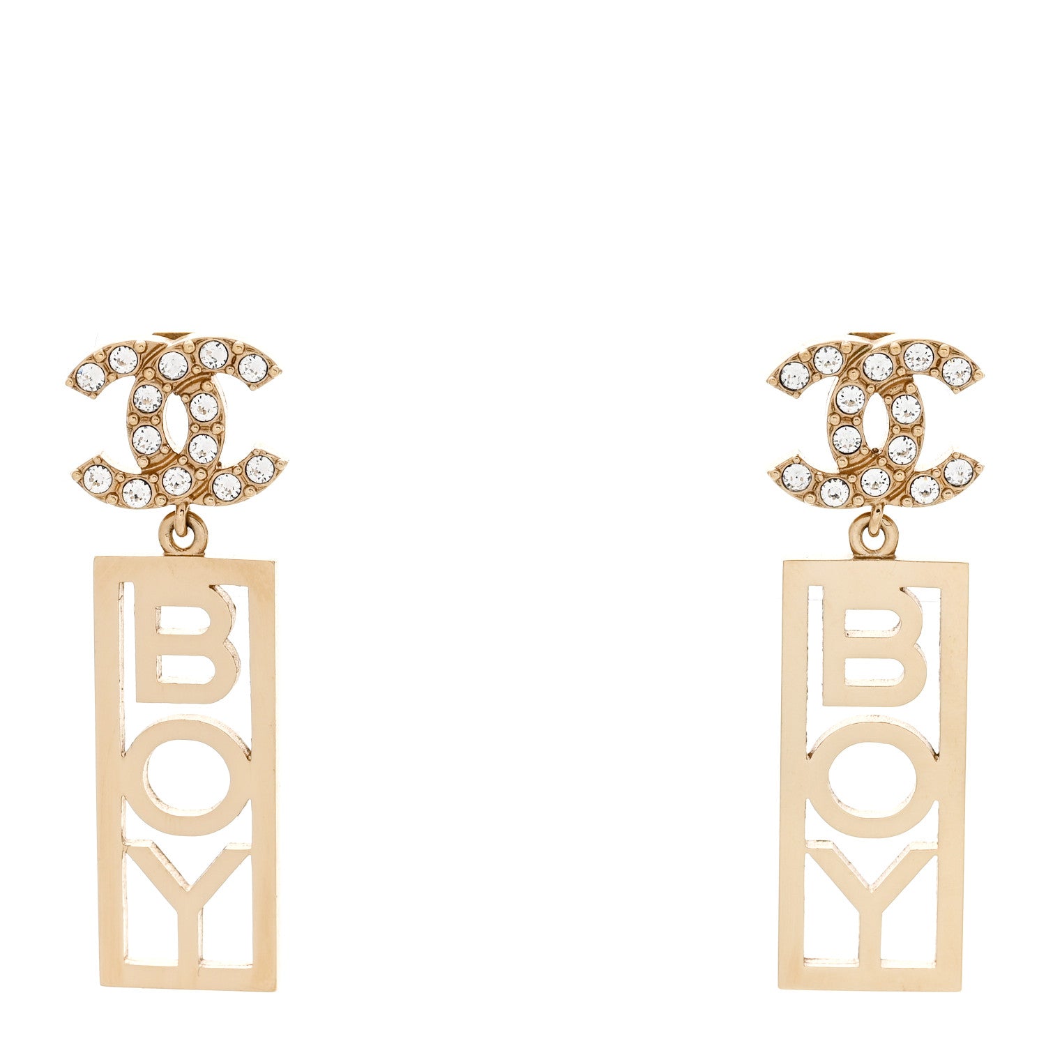 This is an authentic pair of CHANEL Crystal Boy Earrings Gold. These chic earrings feature crystal embellished CC post that attach to a gold lettering BOY framed dangle accessory.Follow this item for alerts. Chanel is a registered trademark of Chanel. FASHIONPHILE is not affiliated with Chanel.