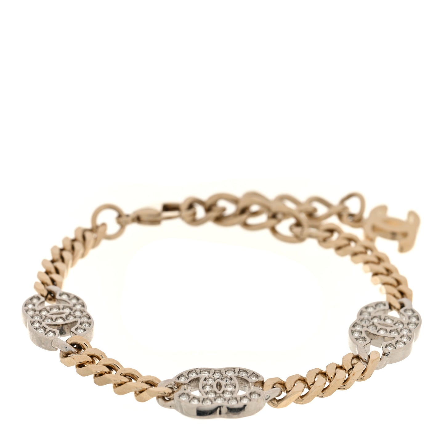 This is an authentic CHANEL Crystal CC Chain Bracelet in Gold and Silver. This stylish bracelet features a gold chain holding crystal encrusted silver Chanel CC logos.Follow this item for alerts. Chanel is a registered trademark of Chanel. FASHIONPHILE is not affiliated with Chanel.