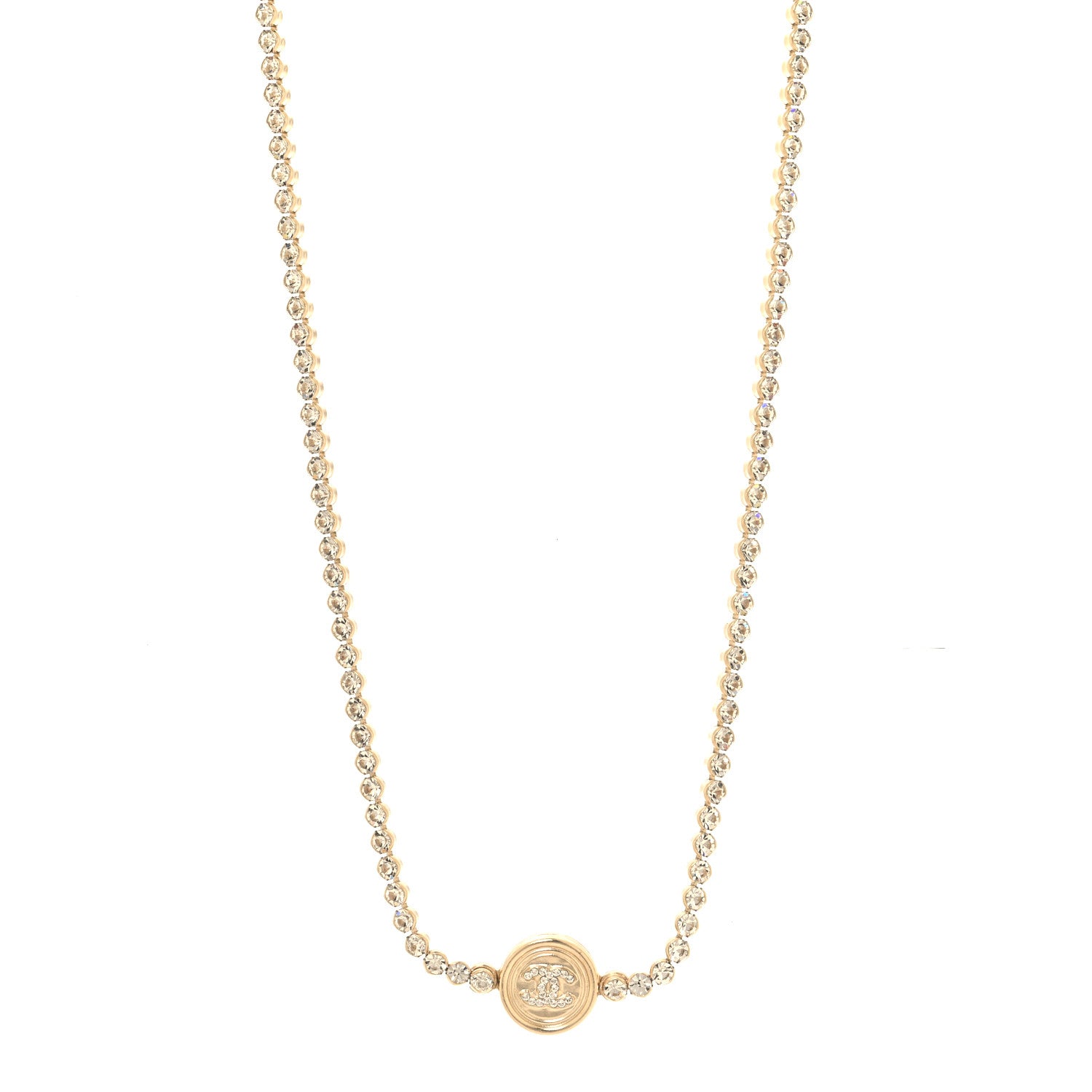 This is an authentic CHANEL Crystal CC Chain Short Necklace in Gold. This stunning gold tone choker necklace features a crystal embellished chain and a round pendant with a crystal CC logo.Follow this item for alerts. Chanel is a registered trademark of Chanel. FASHIONPHILE is not affiliated with Chanel.