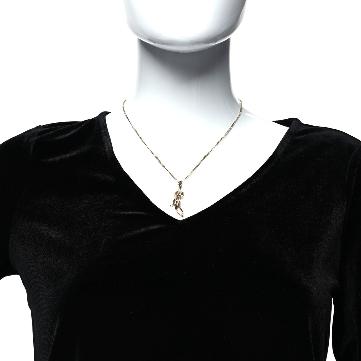 This is an authentic CHANEL Crystal CC Heel Motif Necklace in Gold. This chic Chanel necklace features a gold tone chain, and two crystal embellished pendants in the form of a Chanel heel and a Chanel CC logo.Follow this item for alerts. Chanel is a registered trademark of Chanel. FASHIONPHILE is not affiliated with Chanel.