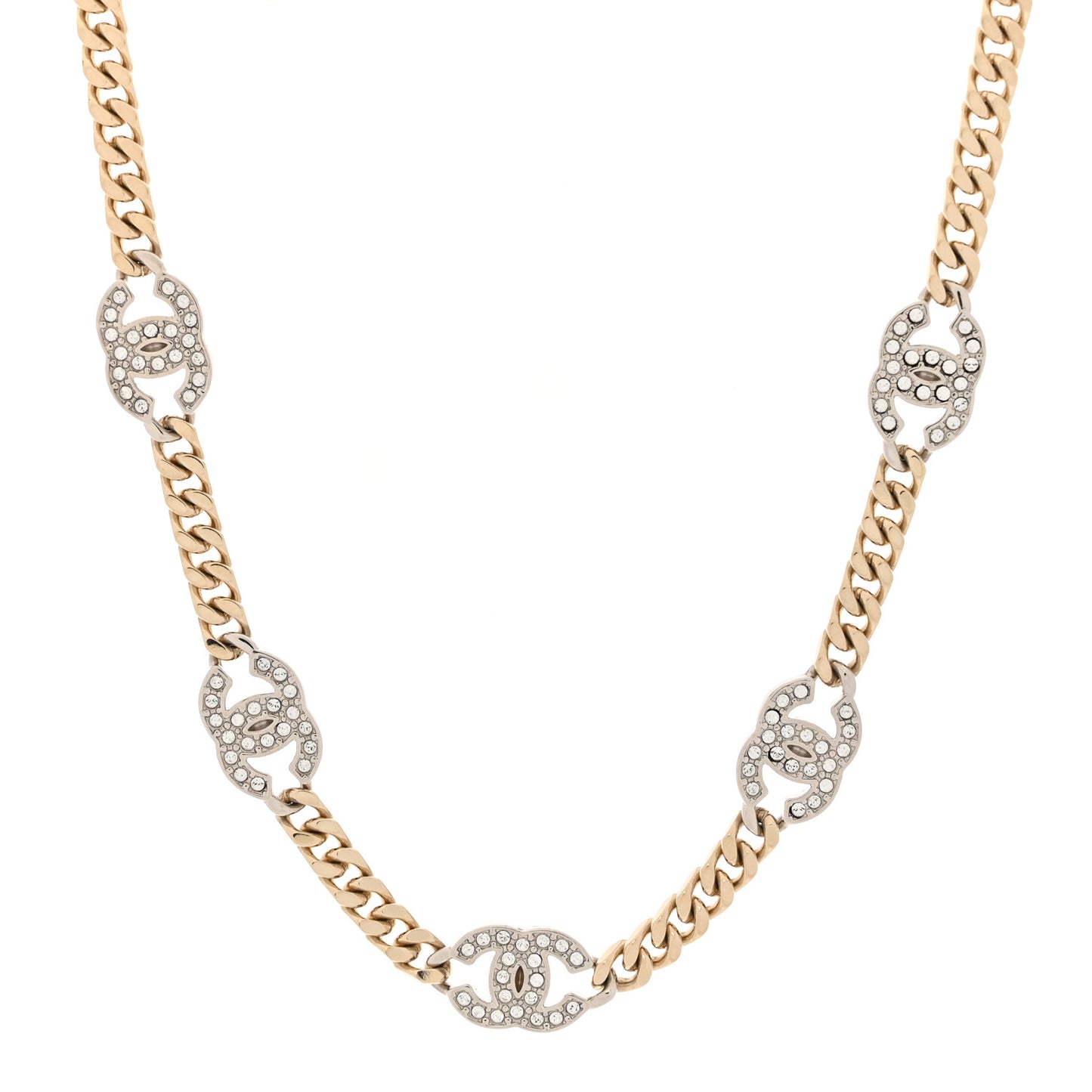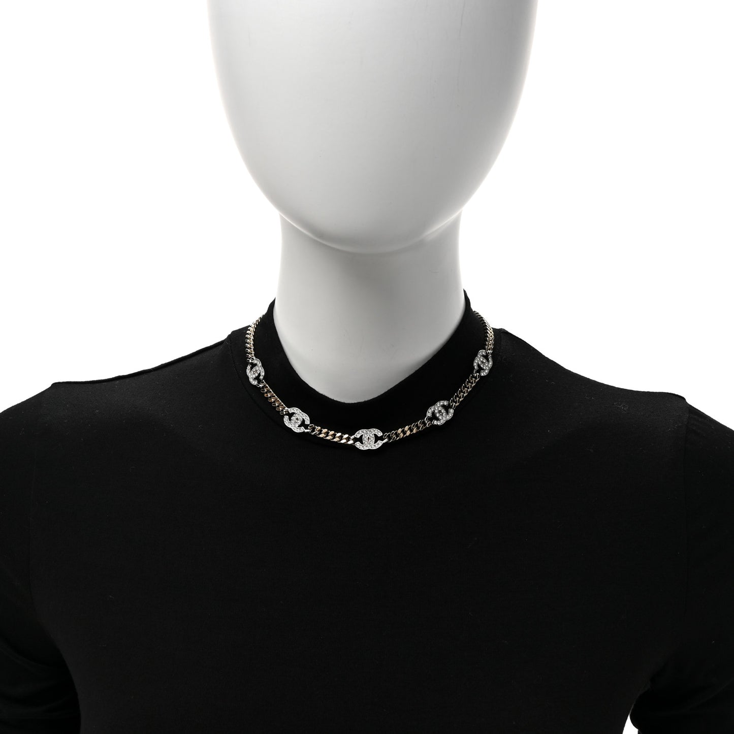 This is an authentic CHANEL Crystal Chain CC Link Choker in Gold and Silver. This stylish choker necklace features a gold chain with crystal encrusted silver CC logos.Follow this item for alerts. Chanel is a registered trademark of Chanel. FASHIONPHILE is not affiliated with Chanel.