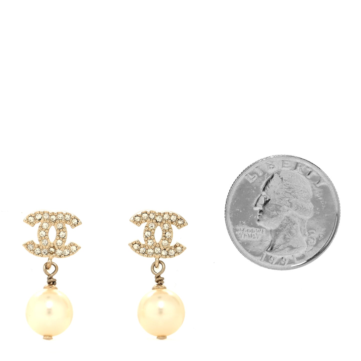 This is an authentic pair of CHANEL Crystal Pearl CC Drop Earrings in Gold. These elegant earrings feature a light gold crystal encrusted CC logo with a dangling resin pearl.Follow this item for alerts. Chanel is a registered trademark of Chanel. FASHIONPHILE is not affiliated with Chanel.