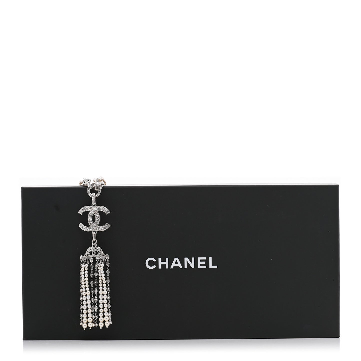 This is an authentic CHANEL Crystal Pearl CC Drop Necklace in Silver. This elegant piece is five strands of faux pearls. It features a dangling Chanel pendant embedded with crystals and in its center a CC logo surrounded by pearls.Follow this item for alerts. Chanel is a registered trademark of Chanel. FASHIONPHILE is not affiliated with Chanel.