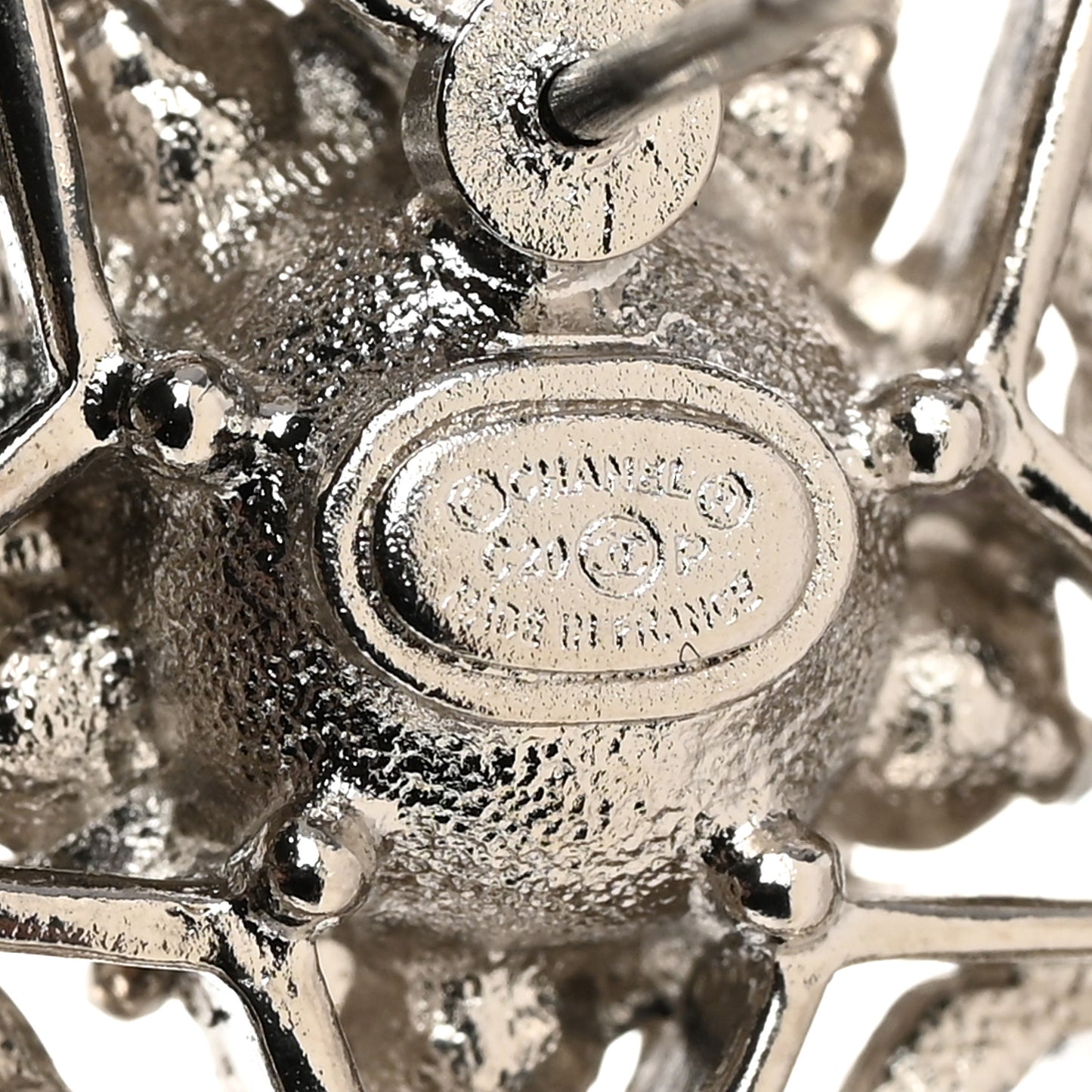This is an authentic pair of CHANEL Crystal Pearl Large Camellia CC Earrings in Silver. These stylish earrings are composed of crystal-embellished silver details with a suspending camellia flower made of CC logos featuring a faux pearl in the center.Follow this item for alerts. Chanel is a registered trademark of Chanel. FASHIONPHILE is not affiliated with Chanel.