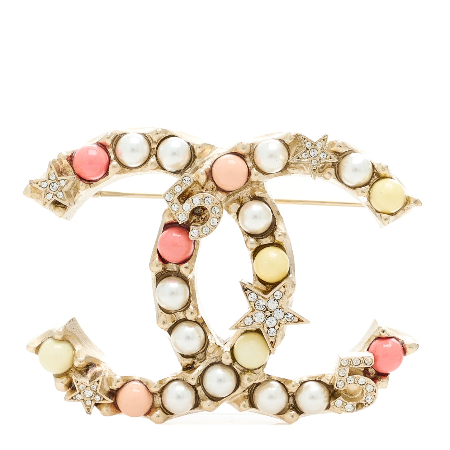 Chanel/ Accessories/ Pins & Brooches /Chanel Crystal Pearl Resin CC Star No 5 Brooch Gold White Pink