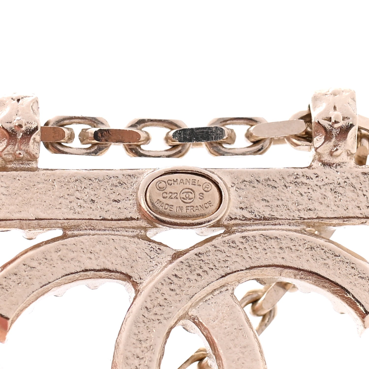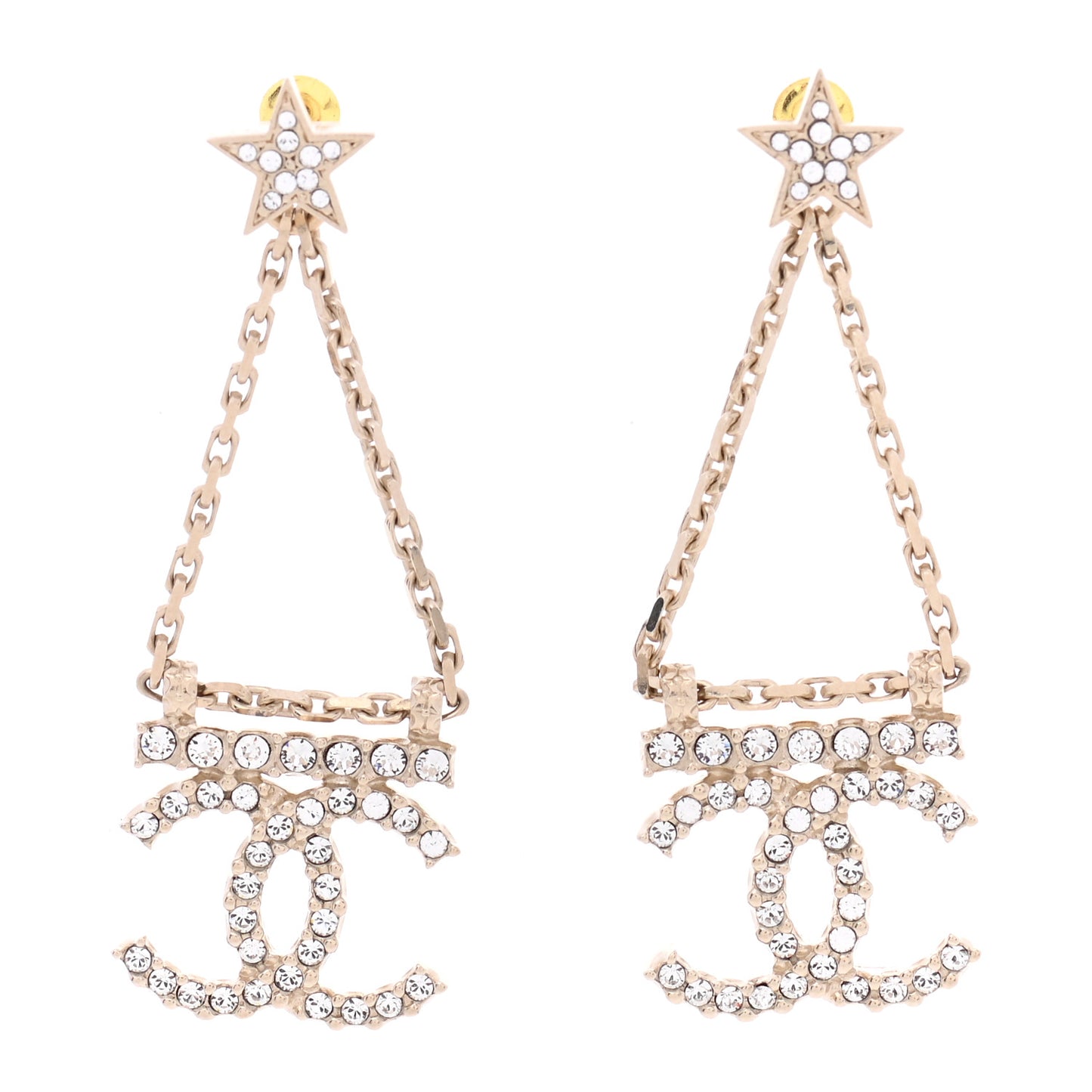 This is an authentic pair of CHANEL Crystal Star Drop CC Earrings in Gold. These classic earrings feature the signature Chanel CC at the earlobe accented by a cascading crystal chain and a star at the top both encrusted with crystals.Follow this item for alerts. Chanel is a registered trademark of Chanel. FASHIONPHILE is not affiliated with Chanel.