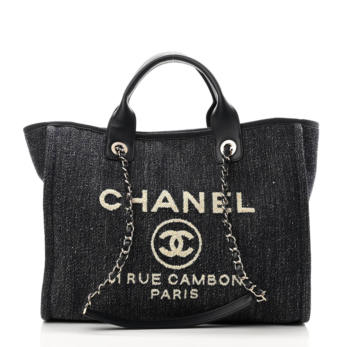 This is an authentic CHANEL Denim Medium Deauville Tote in Dark Blue and White. This stylish handbag is crafted of durable dark blue denim with an embroidered Chanel Rue Cambon Paris logo on the front. The bag features rolled leather top handles, blue grosgrain fabric top trim, and fabric threaded gold chain shoulder straps. The top is open to a fabric interior with zipper and patch pockets.Follow this item for alerts. Chanel is a registered trademark of Chanel. FASHIONPHILE is not affiliated with Chanel.