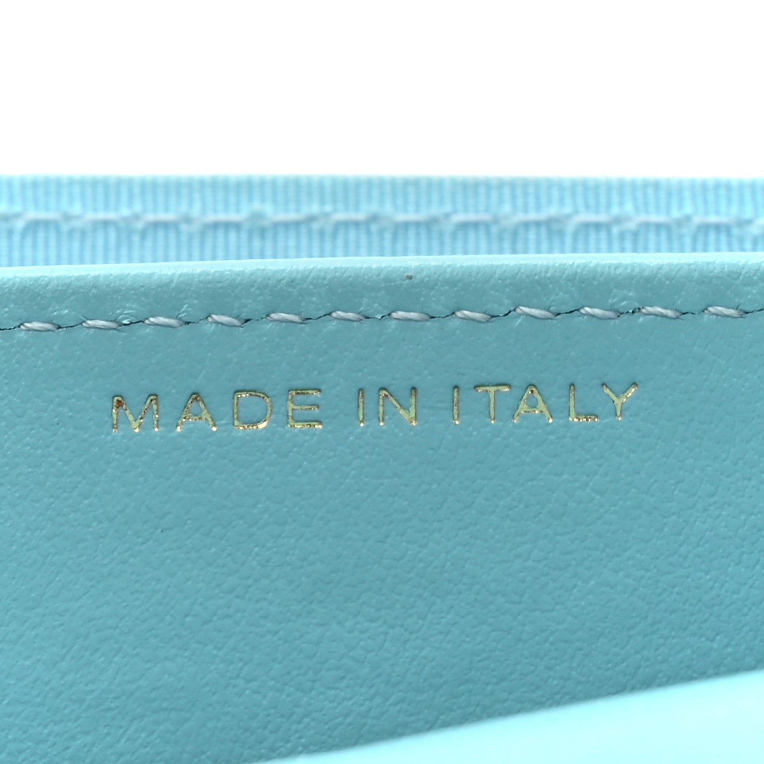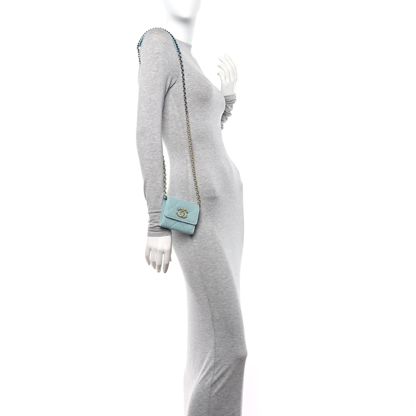 Denim is an authentic CHANEL Lambskin Quilted Chanel 19 Flap Card Holder With Chain in Light Blue. This chic shoulder bag is crafted of blue diamond quilted denim. This handbag features a leather threaded chain-link shoulder strap and a Chanel CC logo on the front. It opens to a partitioned fabric interior.Follow this item for alerts. Chanel is a registered trademark of Chanel. FASHIONPHILE is not affiliated with Chanel.