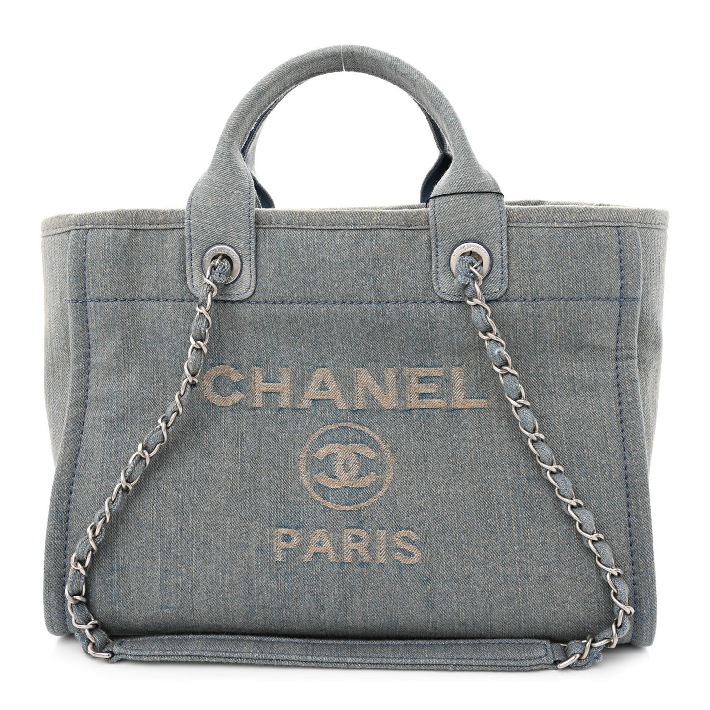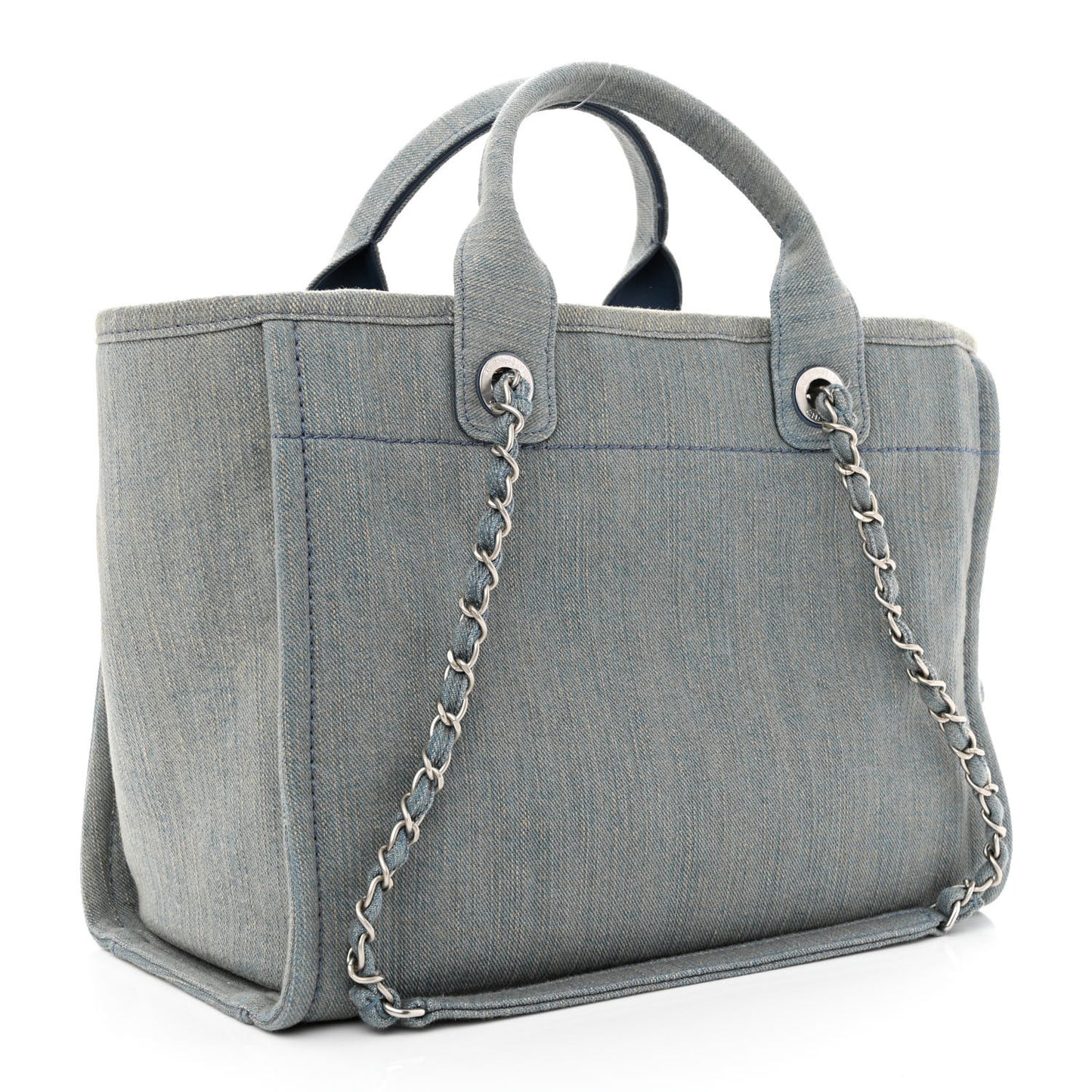 This is an authentic CHANEL Denim Small Deauville Distressed Denim Bag. This lovely bag is crafted of fine blue denim with a Chanel advertisement logo. The shoulder bag features rolled blue leather top handles and polished silver chain link leather threaded shoulder straps. The bag has an open top and a blue fabric interior with zipper and patch pockets and a removable pouch.Follow this item for alerts. Chanel is a registered trademark of Chanel. FASHIONPHILE is not affiliated with Chanel.
