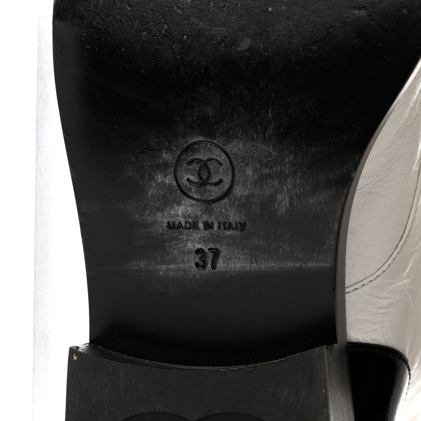 Chanel/ Accessories/ Shoes /Chanel Distressed Patent Cap Toe Combat Boots 37 White Black