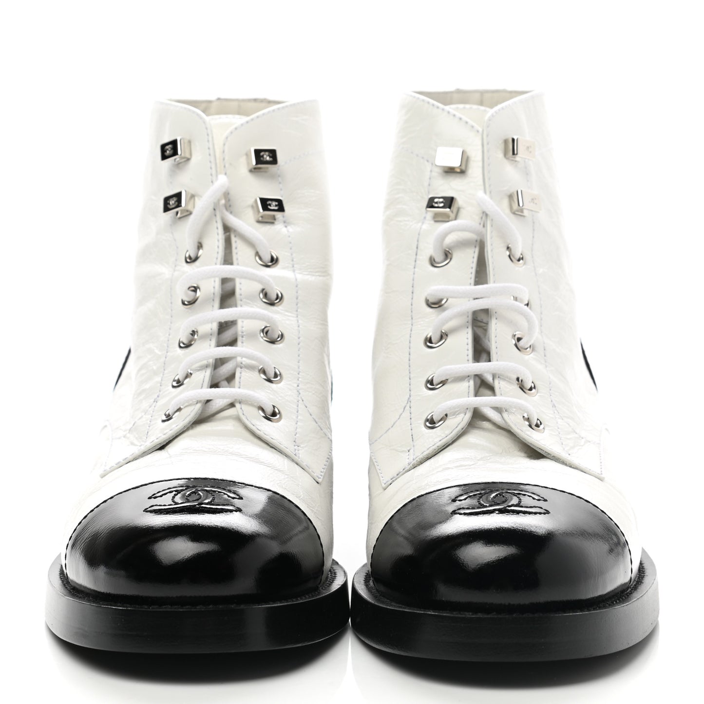 Chanel/ Accessories/ Shoes /Chanel Distressed Patent Cap Toe Combat Boots 40 White Black