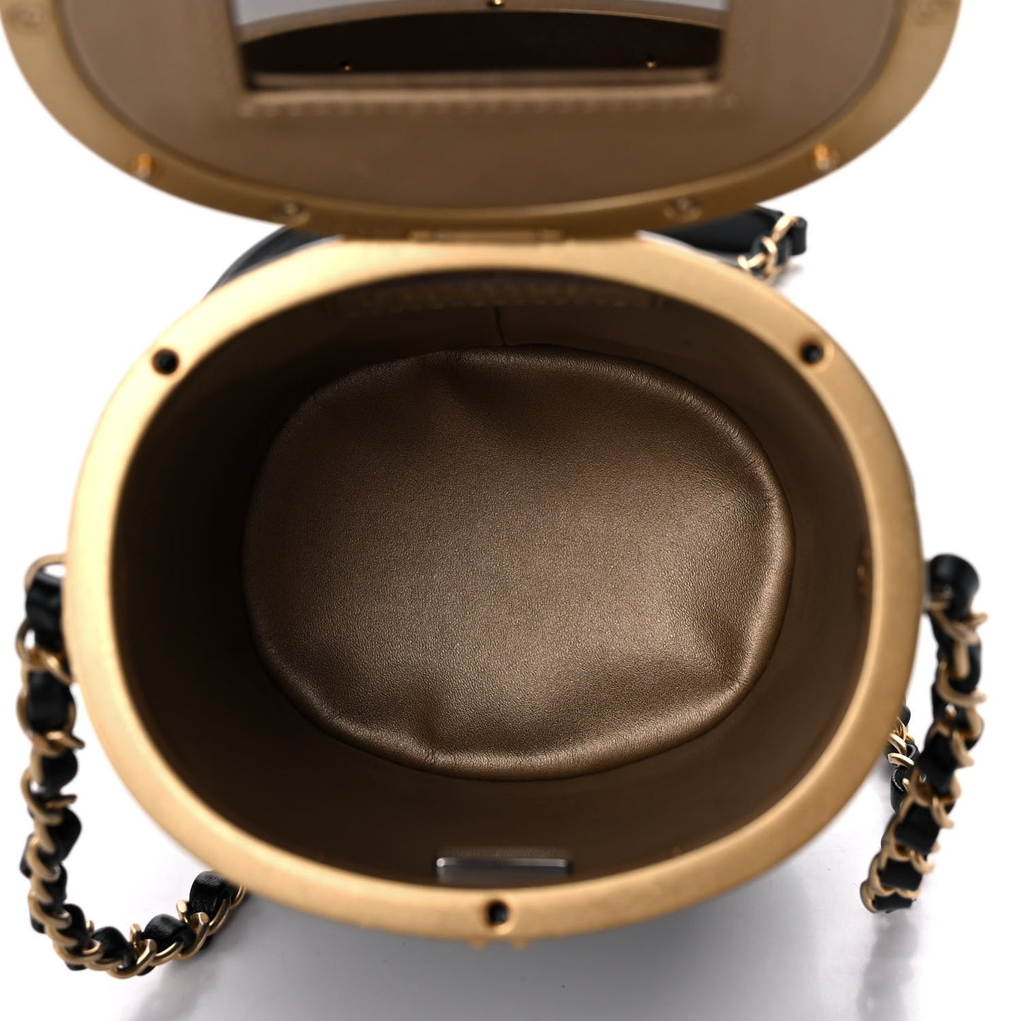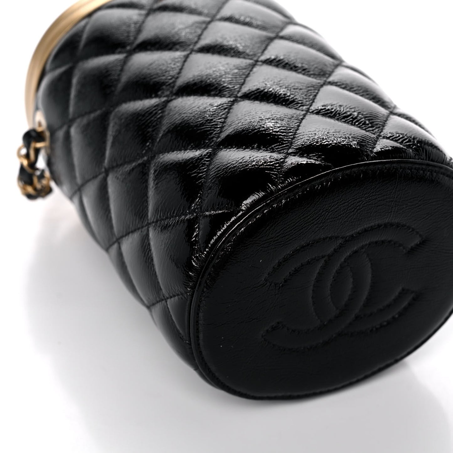 This is an authentic CHANEL Distressed Patent Quilted Crown Box Bag in Black. This chic shoulder bag is crafted of diamond quilted patent calfskin leather in black. The bag features a leather threaded gold chain shoulder strap and gold hardware. The gold CC logo flip lock opens to a gold metallic leather interior with a mirror.Follow this item for alerts. Chanel is a registered trademark of Chanel. FASHIONPHILE is not affiliated with Chanel.
