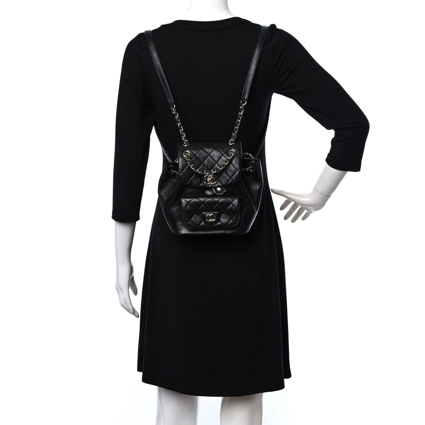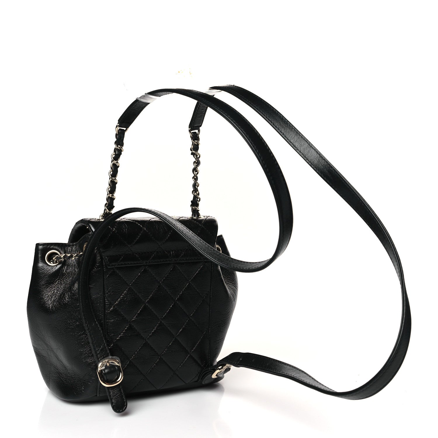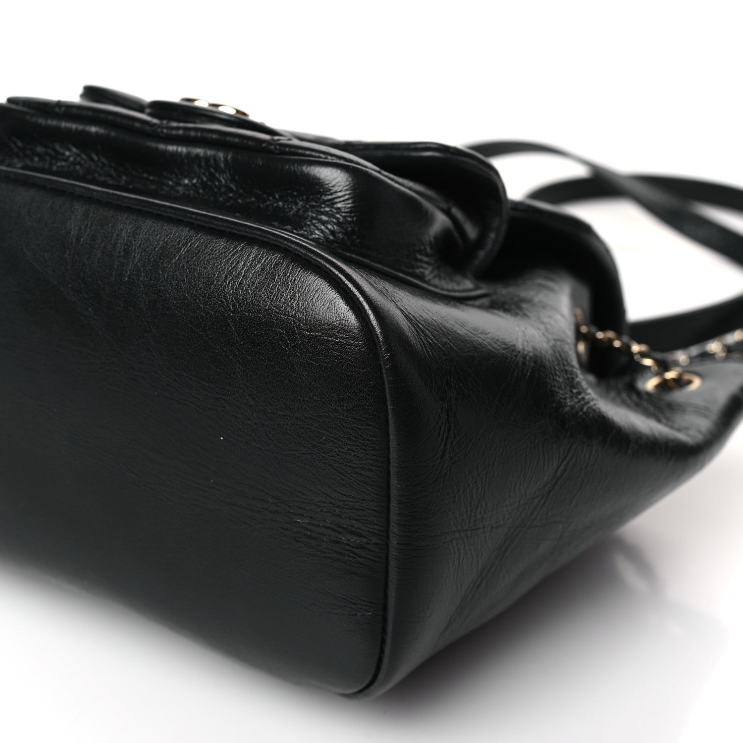 This is an authentic CHANEL Glazed Aged Calfskin Quilted Small Duma Drawstring Backpack in Black. This stylish backpack is beautifully crafted of aged leather in black. The backpack features polished light gold chain link leather threaded shoulder straps, a facing external dual zipper pocket, a facing flap that opens with a polished gold Chanel CC turn lock, and closes with a black leather cinch-cord. This opens to a spacious black fabric interior with a patch pocket.