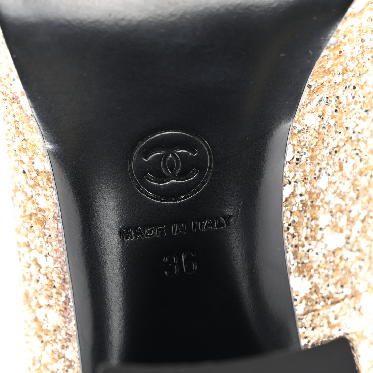 Chanel/ Accessories/ Shoes /Chanel Glitter Lambskin Cap Toe CC Mary Jane Pumps 36 Light Gold Black