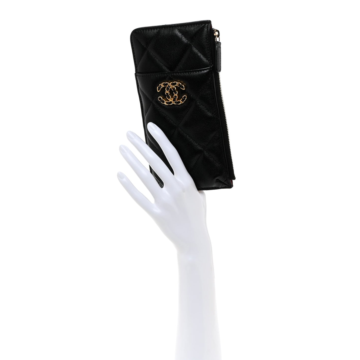This is an authentic CHANEL Goatskin Quilted Chanel 19 Flat Wallet Pouch in Black. This chic wallet is crafted of padded diamond-quilted goatskin leather in black. This pouch features a leather-threaded gold chain Chanel CC logo on the front pocket, card slots on the back, and a side zipper that opens to a red fabric interior, ideal for small necessities.Follow this item for alerts. Chanel is a registered trademark of Chanel. FASHIONPHILE is not affiliated with Chanel.
