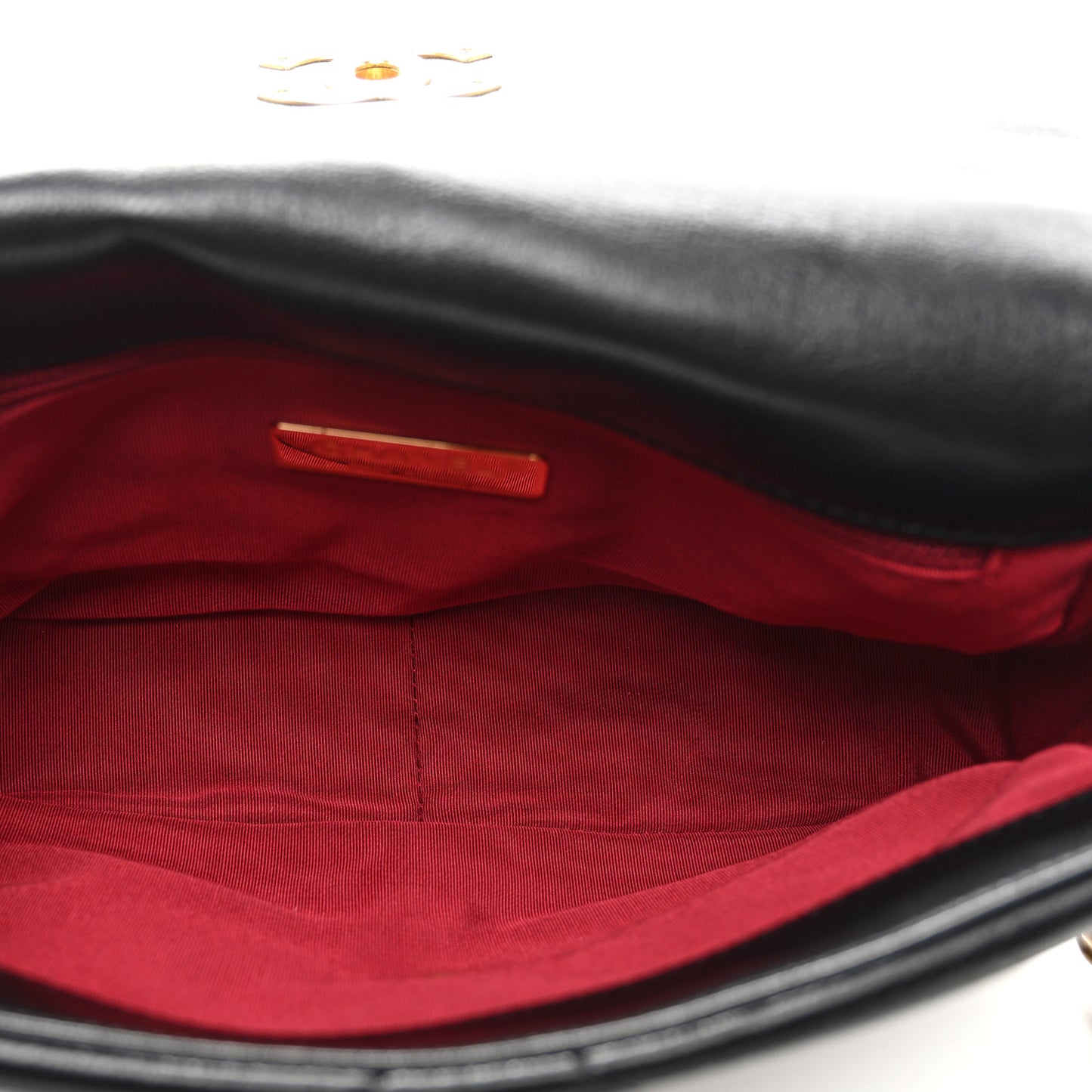 This is an authentic CHANEL Goatskin Quilted Medium Chanel 19 Flap in Black. This pillowy soft shoulder bag is crafted of oversized quilted goatskin leather in black. The refined bag features a chain detail CC turn-lock on the flap, a magnetic snap pocket on the back, a chunky matte gold chain top handle, and a leather threaded gradient gold to ruthenium chain-link shoulder strap. The front flap opens to a red fabric interior with a zipper pocket.