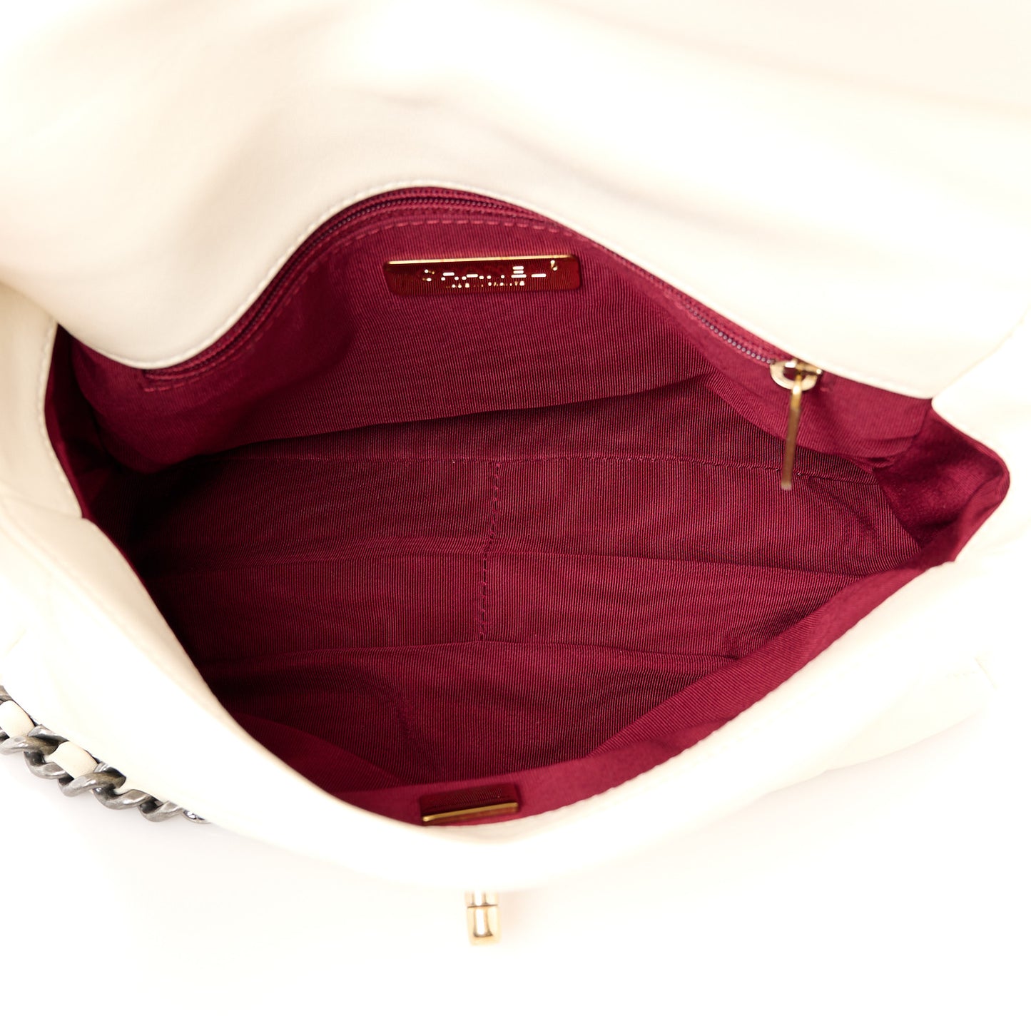 This is an authentic CHANEL Goatskin Quilted Medium Chanel 19 Flap. This pillowy soft shoulder bag is crafted of oversized quilted goatskin leather in white. The bag features an aged chain detailed CC turn-lock on the flap, a magnetic snap pocket at the rear, and a leather threaded aged gold, ruthenium, and silver chain-link shoulder strap with a leather shoulder pad. The front flap opens to a fabric interior with a zipper pocket.