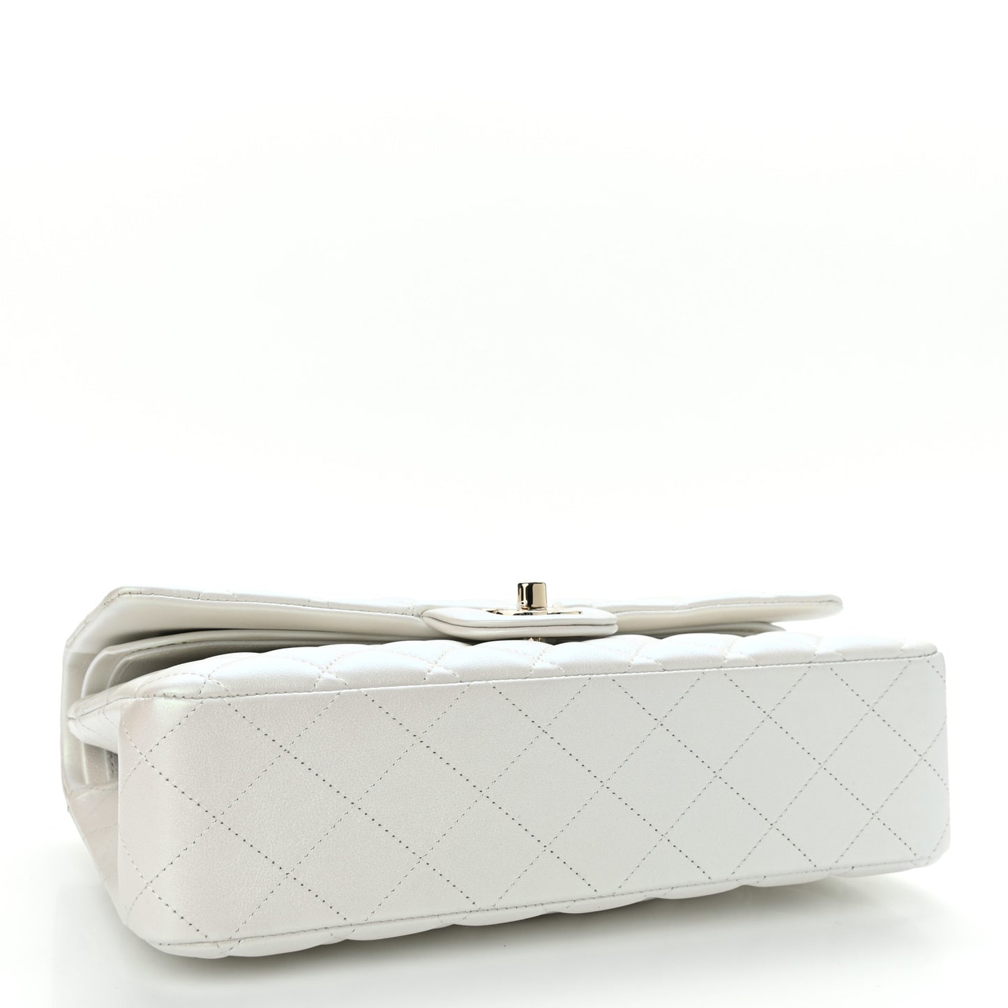 This is an authentic CHANEL Iridescent Calfskin Quilted Medium Double Flap in White. This chic shoulder bag is crafted of diamond quilted calfskin leather in iridescent off-white. The shoulder bag features a gold chain-link leather-threaded shoulder strap and a front flap with a light gold classic CC turn-lock. This opens to reveal an inner flap and a matching iridescent leather interior with patch pockets.Follow this item for alerts. Chanel is a registered trademark of Chanel. FASHIONPHILE is not affiliated with Chanel.