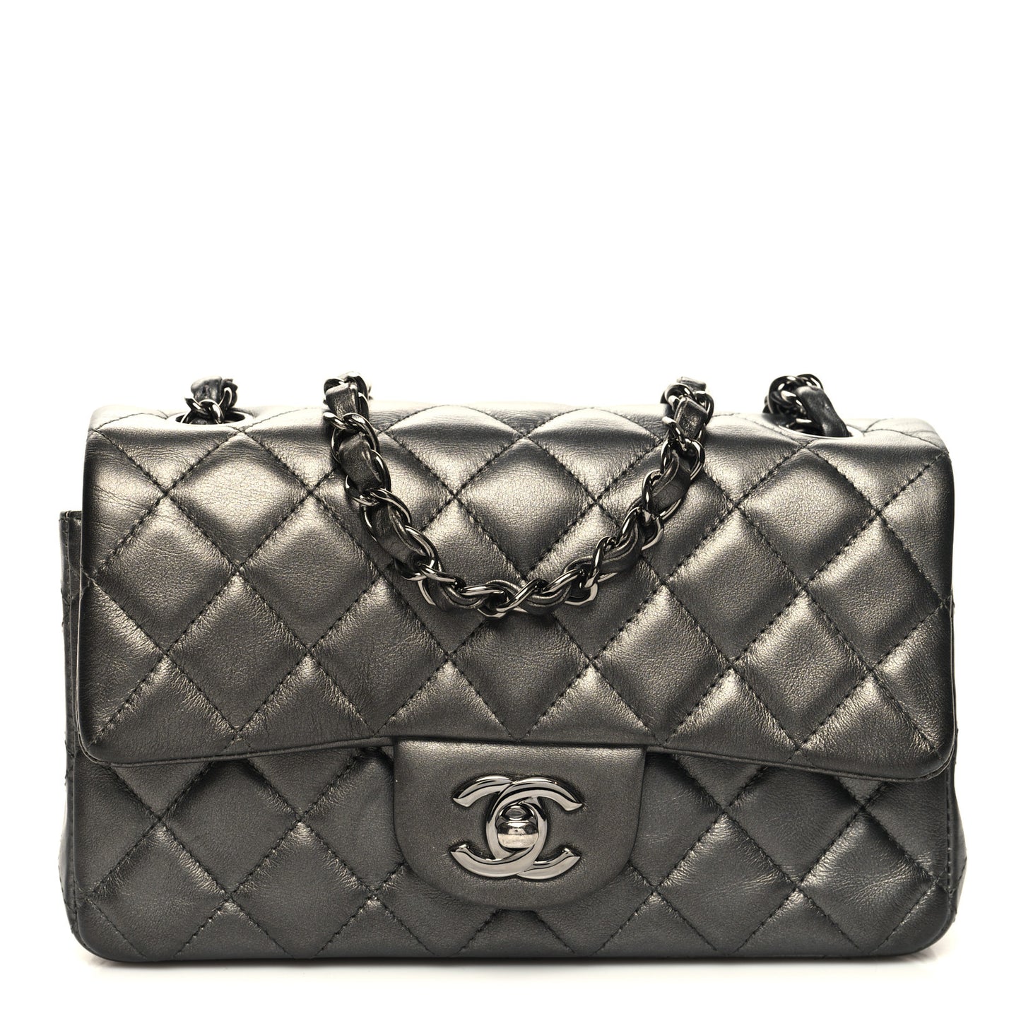 This is an authentic CHANEL Iridescent Calfskin Quilted Mini Rectangular Flap in Charcoal Grey. This beautiful bag is crafted out of luxurious diamond-quilted calfskin leather in metallic grey. The bag features a leather-threaded polished ruthenium chain shoulder strap, a frontal flap, and a polished ruthenium classic CC turn lock. This opens to a metallic grey leather interior with a patch and zippered pocket.Follow this item for alerts. Chanel is a registered trademark of Chanel. FASHIONPHILE is not affiliated with Chanel.