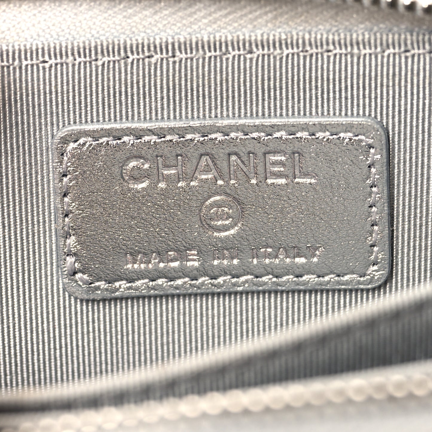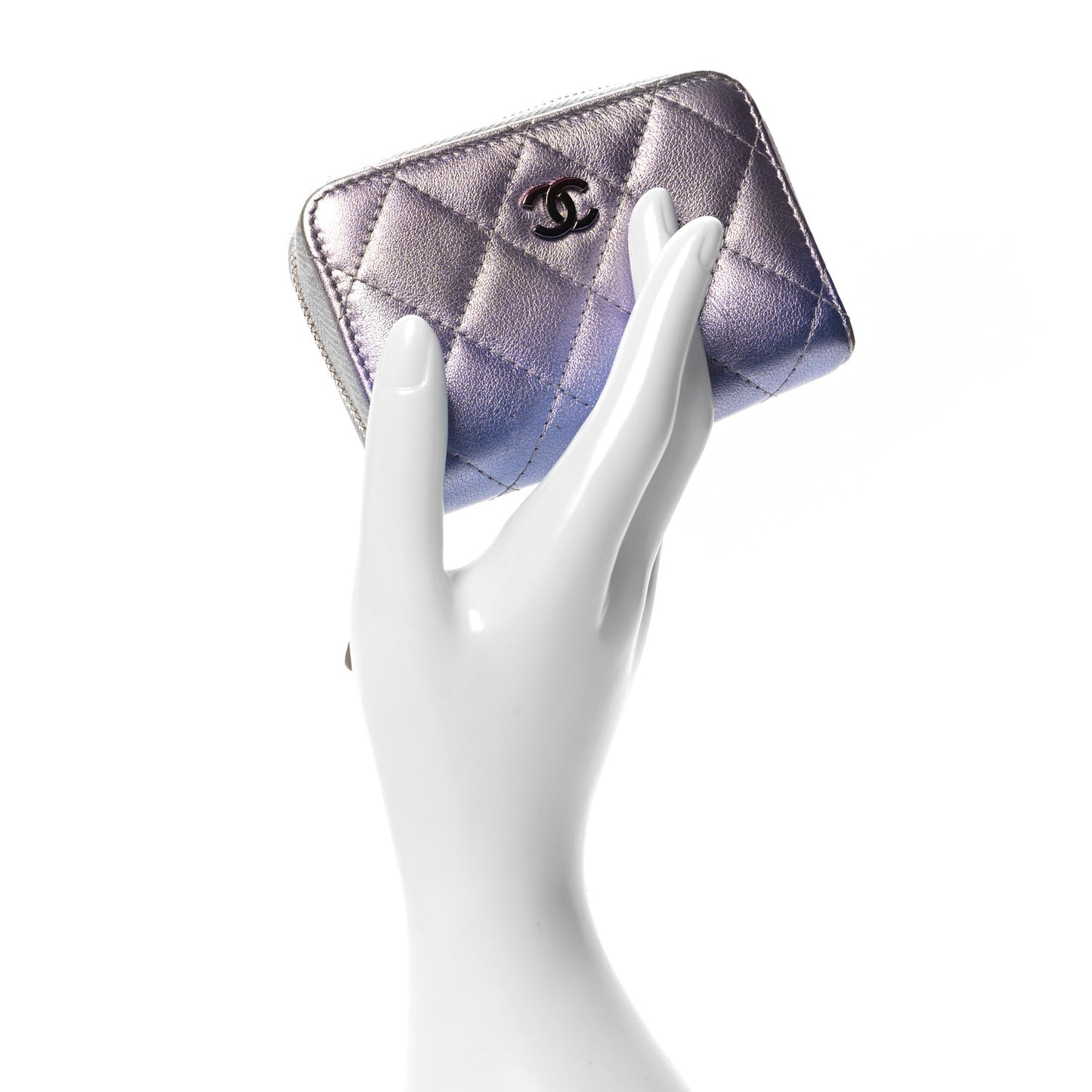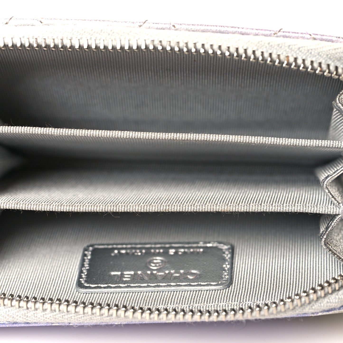 This is an authentic CHANEL Iridescent Calfskin Quilted Zip Coin Purse Wallet in Light Blue. This petite wallet is crafted of soft blue iridescent diamond quilted caviar leather. The purse features a wrap around zipper and a silver CC logo. The zipper opens to a matching partitioned fabric interior.Follow this item for alerts. Chanel is a registered trademark of Chanel. FASHIONPHILE is not affiliated with Chanel.