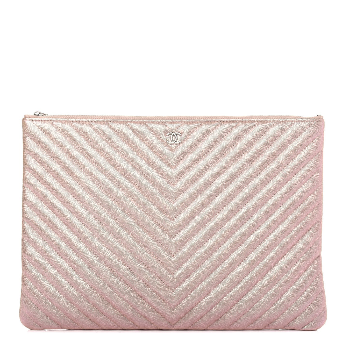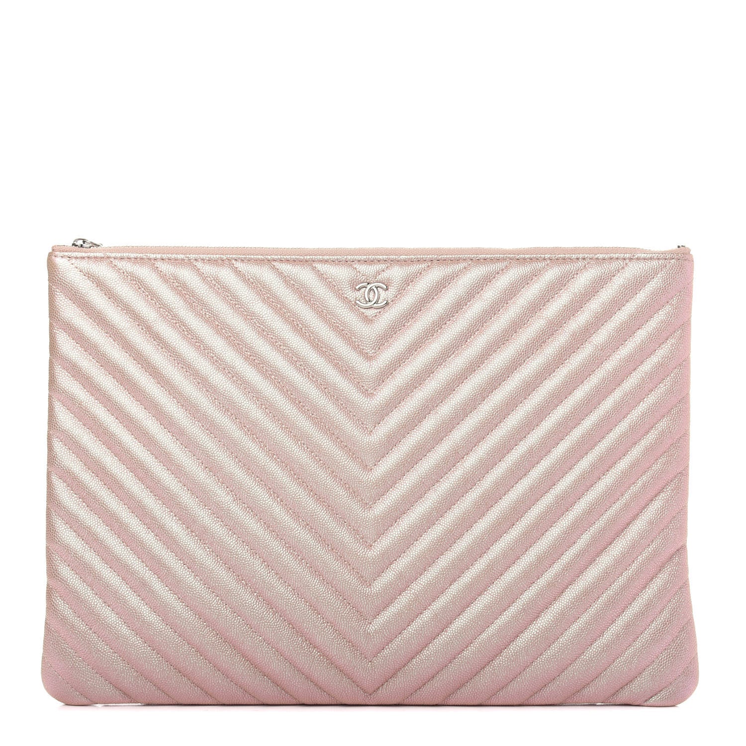 This is an authentic CHANEL Iridescent Caviar Chevron Quilted Medium Cosmetic Case in Light Gold. This stylish cosmetics pouch is crafted of chevron quilted caviar leather in pearl light gold. It features a rear pocket and has a subtle silver Chanel CC logo. The top zipper opens to a tan fabric interior with a zipper pocket.Follow this item for alerts. Chanel is a registered trademark of Chanel. FASHIONPHILE is not affiliated with Chanel.