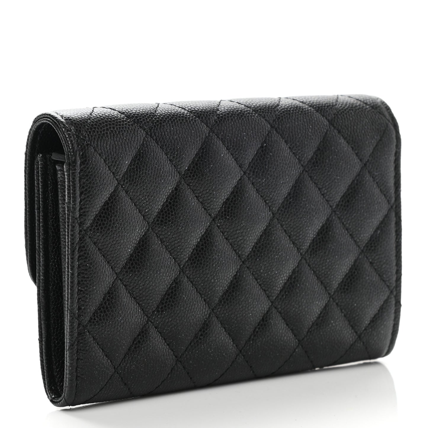 This is an authentic CHANEL Iridescent Caviar Quilted Medium Flap Wallet in Black. This stylish wallet is crafted of beautifully soft diamond quilted iridescent caviar leather in black. The wallet has a facing flap with a polished ruthenium Chanel CC that opens with a snap to a black interior with card slot panels and a central currency zipper pocket.Follow this item for alerts. Chanel is a registered trademark of Chanel. FASHIONPHILE is not affiliated with Chanel.