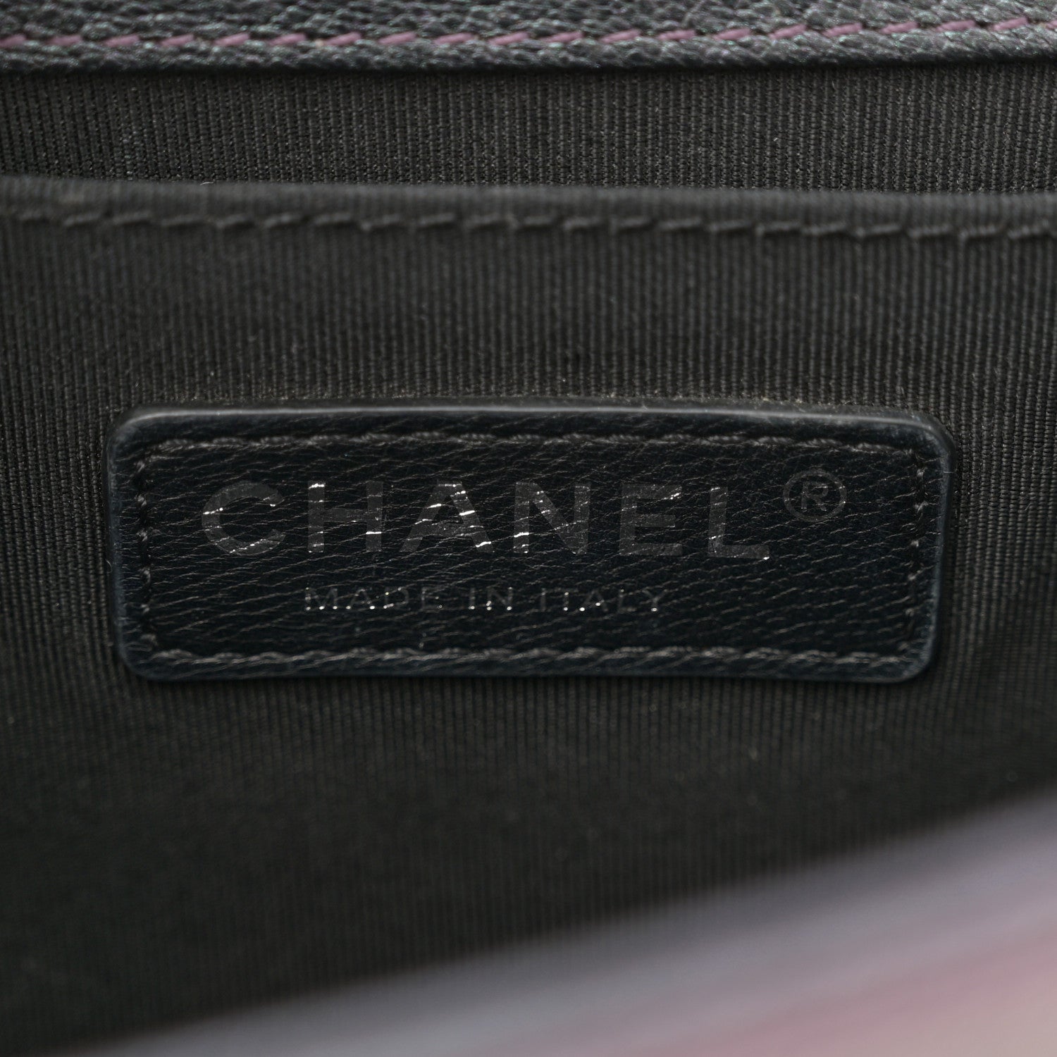 This is an authentic CHANEL Iridescent Goatskin Quilted Small Boy Flap in Purple. This compact shoulder bag is crafted of diamond-quilted iridescent purple goatskin leather, with a linear-quilted border. The bag features an iridescent chain-link shoulder strap with a leather shoulder pad and a matching iridescent boy CC push lock on the crossover flap. The shoulder bag opens to a black fabric interior with a patch pocket.Follow this item for alerts. Chanel is a registered trademark of Chanel. FASHIONPHILE is not affiliated with Chanel.