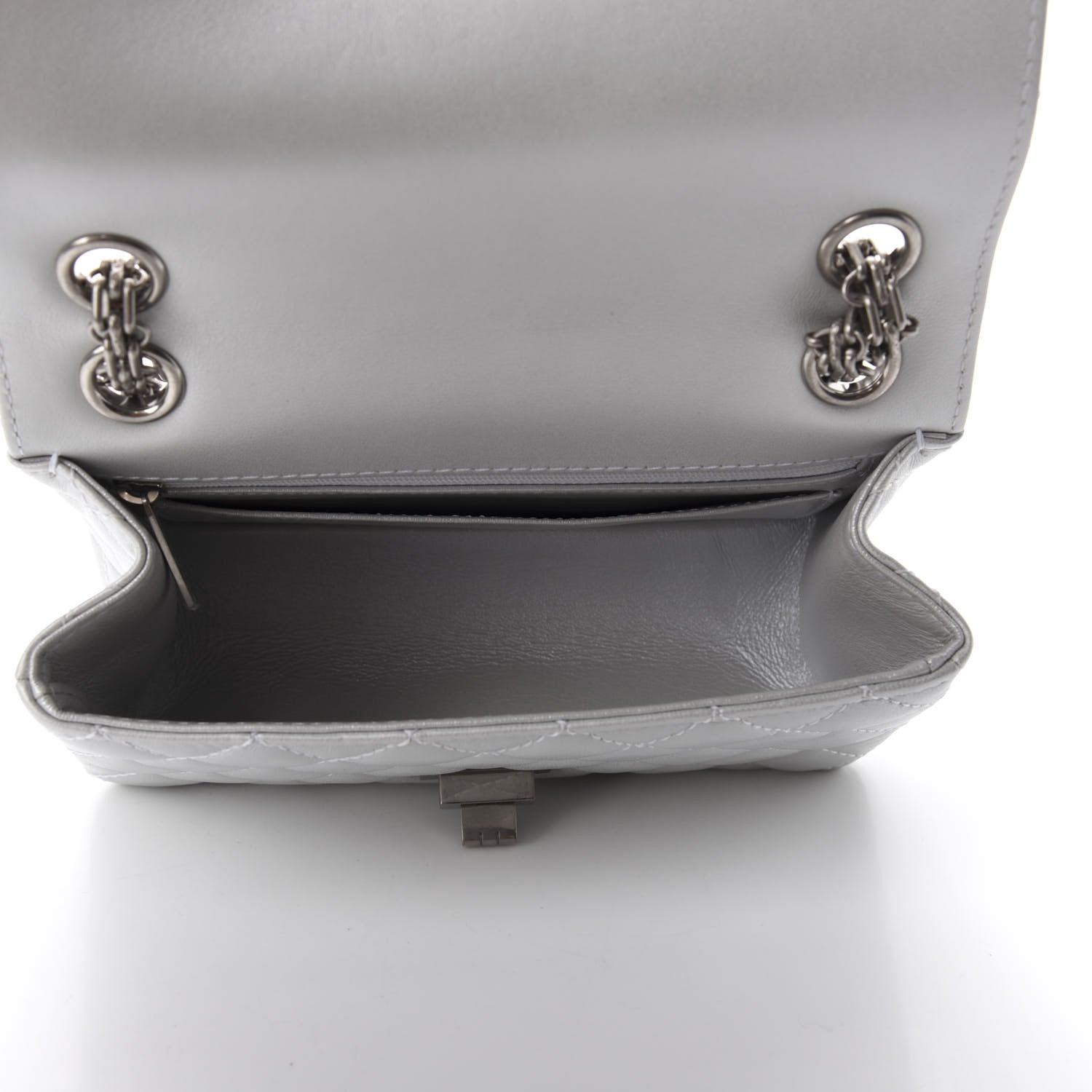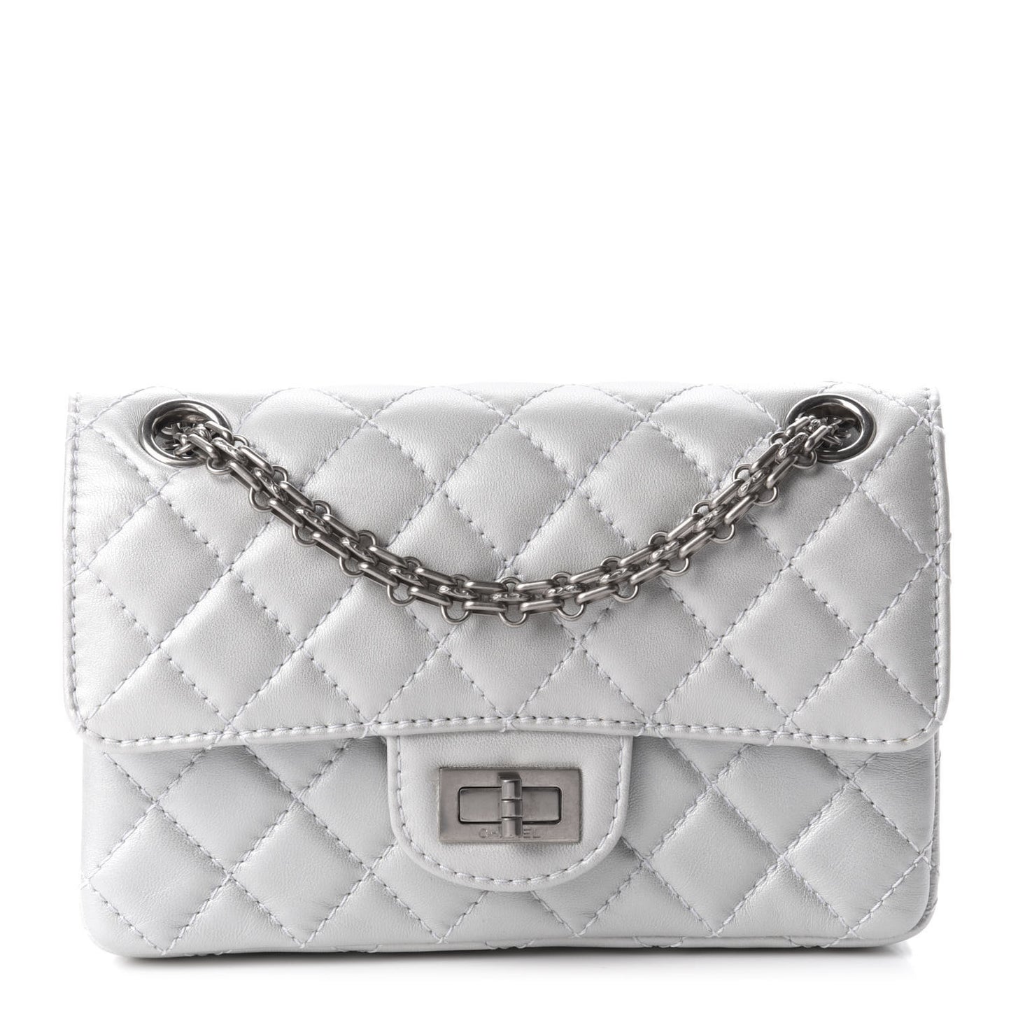 This is an authentic CHANEL Iridescent Lambskin Quilted 2.55 Reissue Mini Flap White. This stylish shoulder bag is beautifully crafted of diamond-quilted leather in metallic white. The bag features a ruthenium reissue chain shoulder strap and a matching ruthenium mademoiselle turn lock on the crossover flap. This opens the bag to a smooth metallic white leather interior with zipper and patch pockets.Follow this item for alerts. Chanel is a registered trademark of Chanel. FASHIONPHILE is not affiliated with Chanel.
