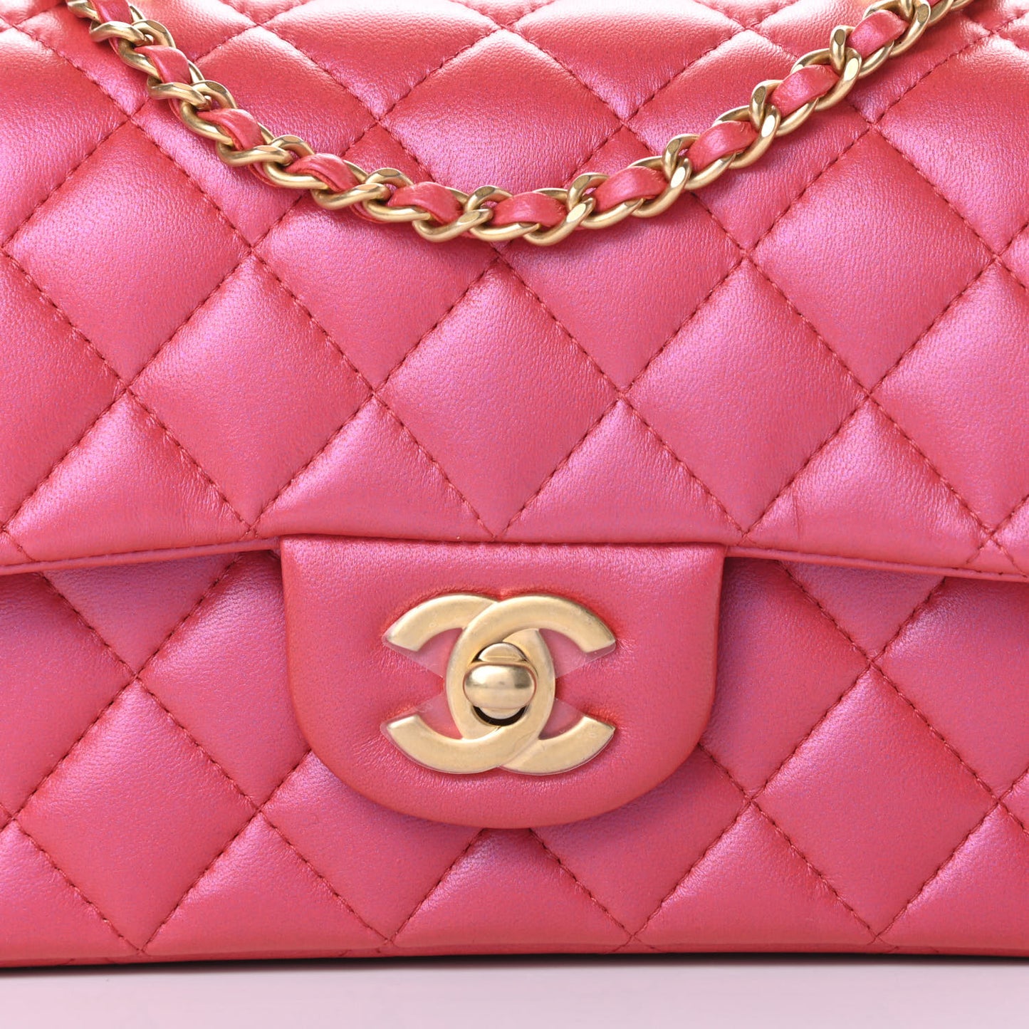 This is an authentic CHANEL Iridescent Lambskin Quilted Mini Top Handle Rectangular Flap in Red. The chic mini crossbody classic is crafted in quilted lambskin leather in metallic pink. The bag features a leather top handle, an aged gold chain link leather threaded shoulder strap and a facing aged gold Chanel CC turn lock. This opens the flap to a pink leather interior with zipper and patch pockets.Follow this item for alerts. Chanel is a registered trademark of Chanel. FASHIONPHILE is not affiliated with Chanel.