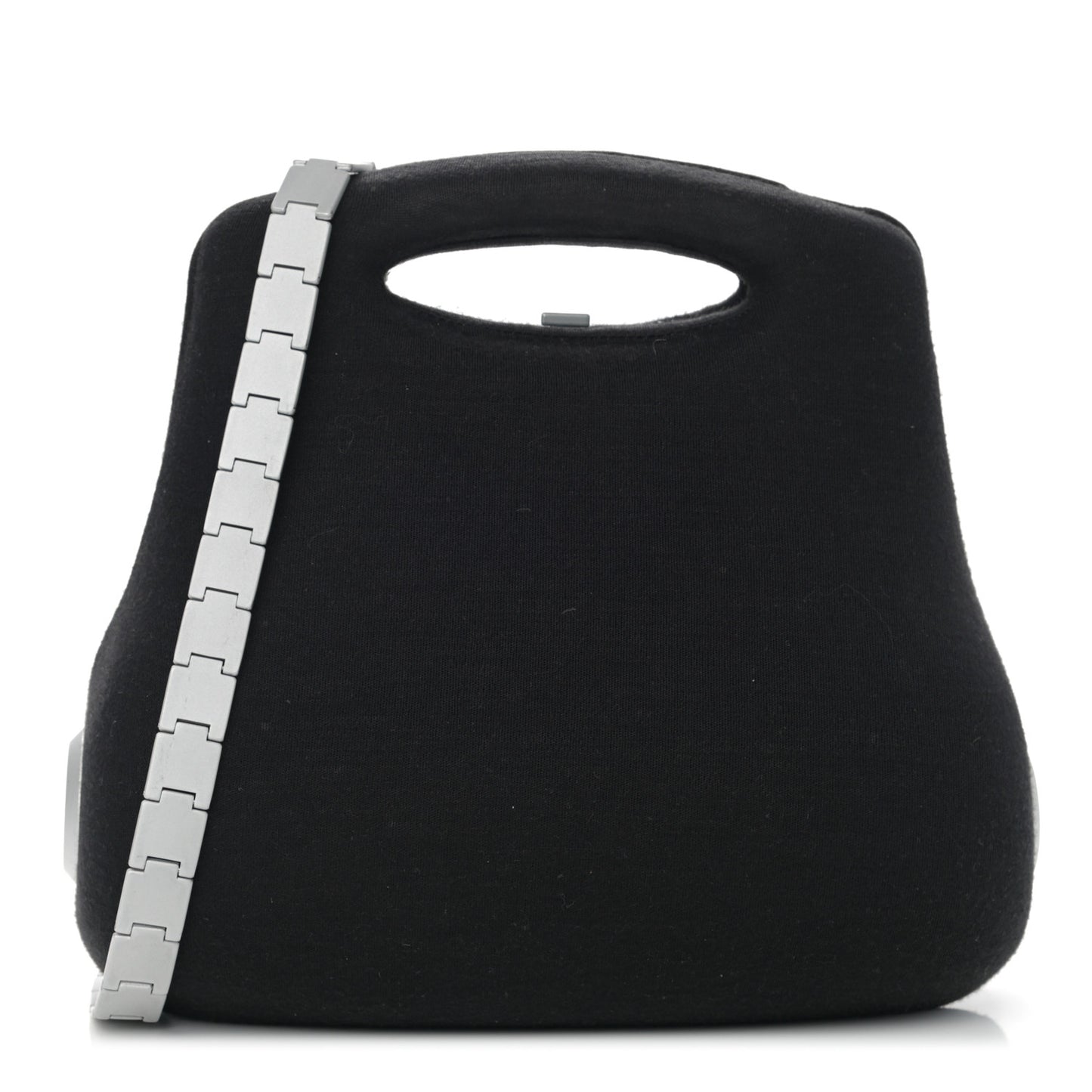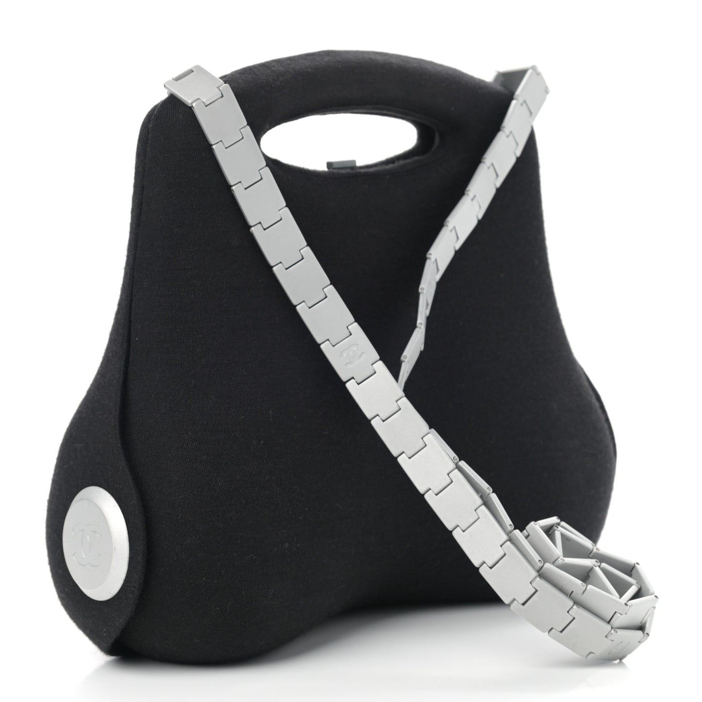 This is an authentic CHANEL Jersey Millennium 2005 Hard Case Crossbody Bag in Black. This futuristic vintage 90's bag features a single rolled chain crossbody shoulder strap, brushed silver hardware and a bold CC logo at both sides. The curved hardshell bag opens to a black nylon interior with two compartments, and features a sleek silver CC push lock closure in the back.Follow this item for alerts. Chanel is a registered trademark of Chanel. FASHIONPHILE is not affiliated with Chanel.
