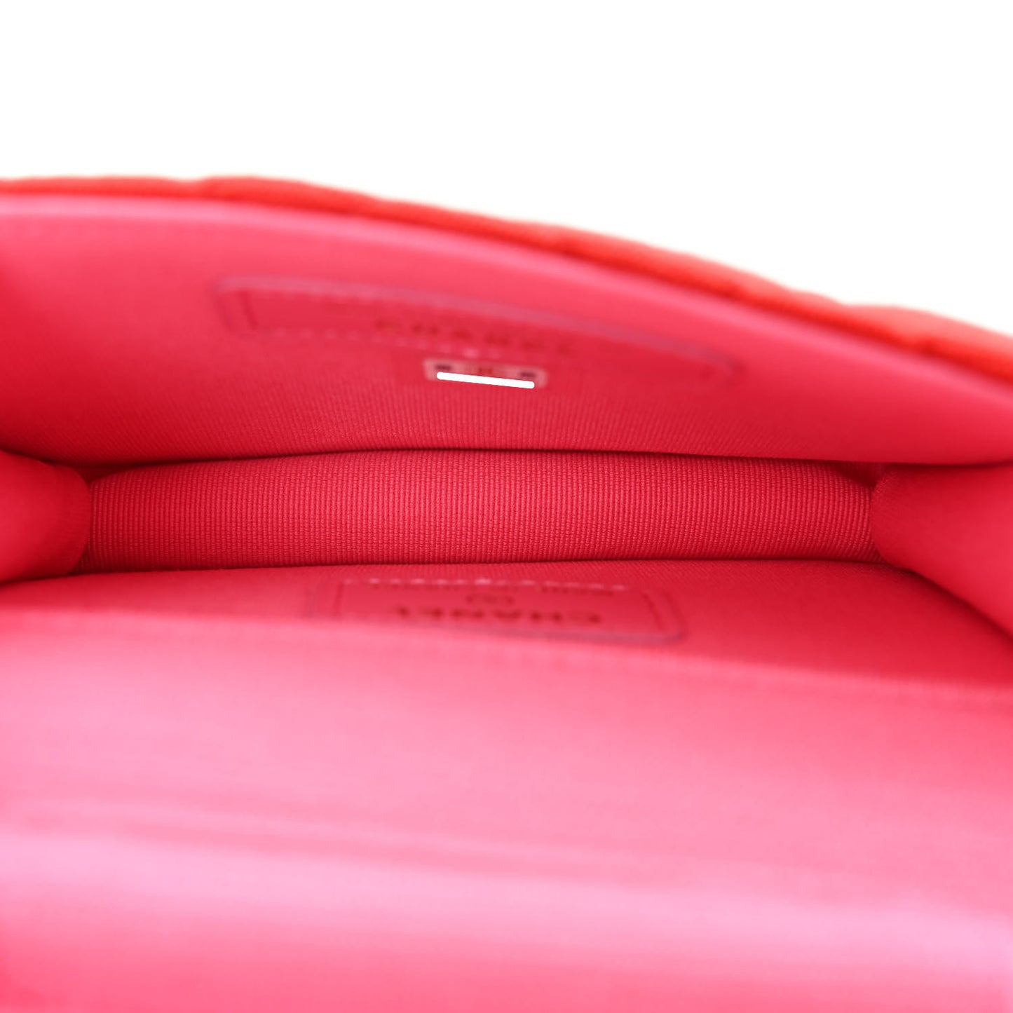 This is an authentic CHANEL Jersey Quilted Clutch With Chain in Red. This mini wallet on chain is crafted of quilted red canvas. It features a red leather threaded gold chain strap and a gold Chanel CC logo. The flap opens to a pink fabric interior.Follow this item for alerts. Chanel is a registered trademark of Chanel. FASHIONPHILE is not affiliated with Chanel.
